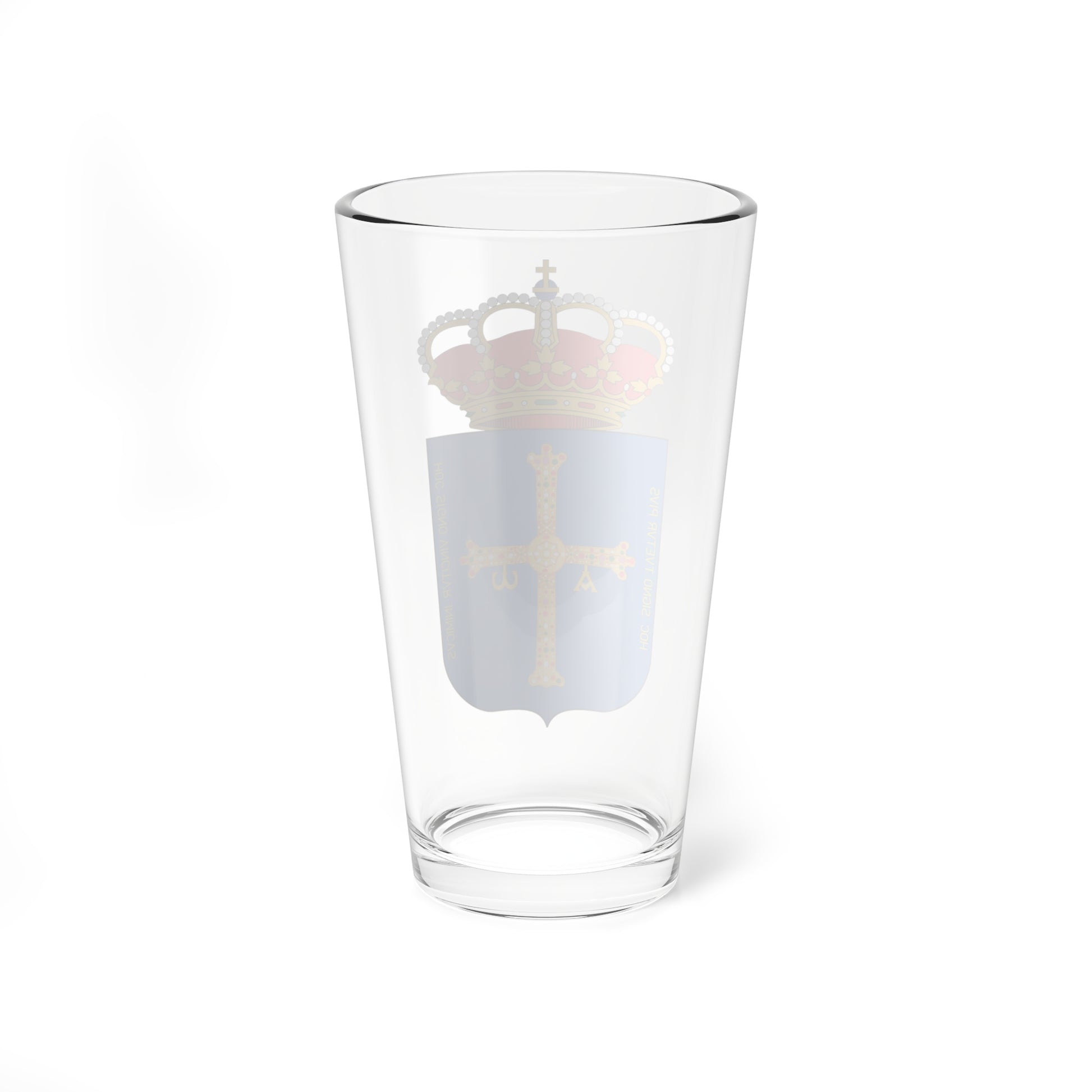 This pint glass showcases the iconic Escudo de Asturias, the official coat of arms of the Autonomous Community of Asturias in Spain. The design is a powerful representation of Asturian history, culture, and identity, rendered in a striking visual format.