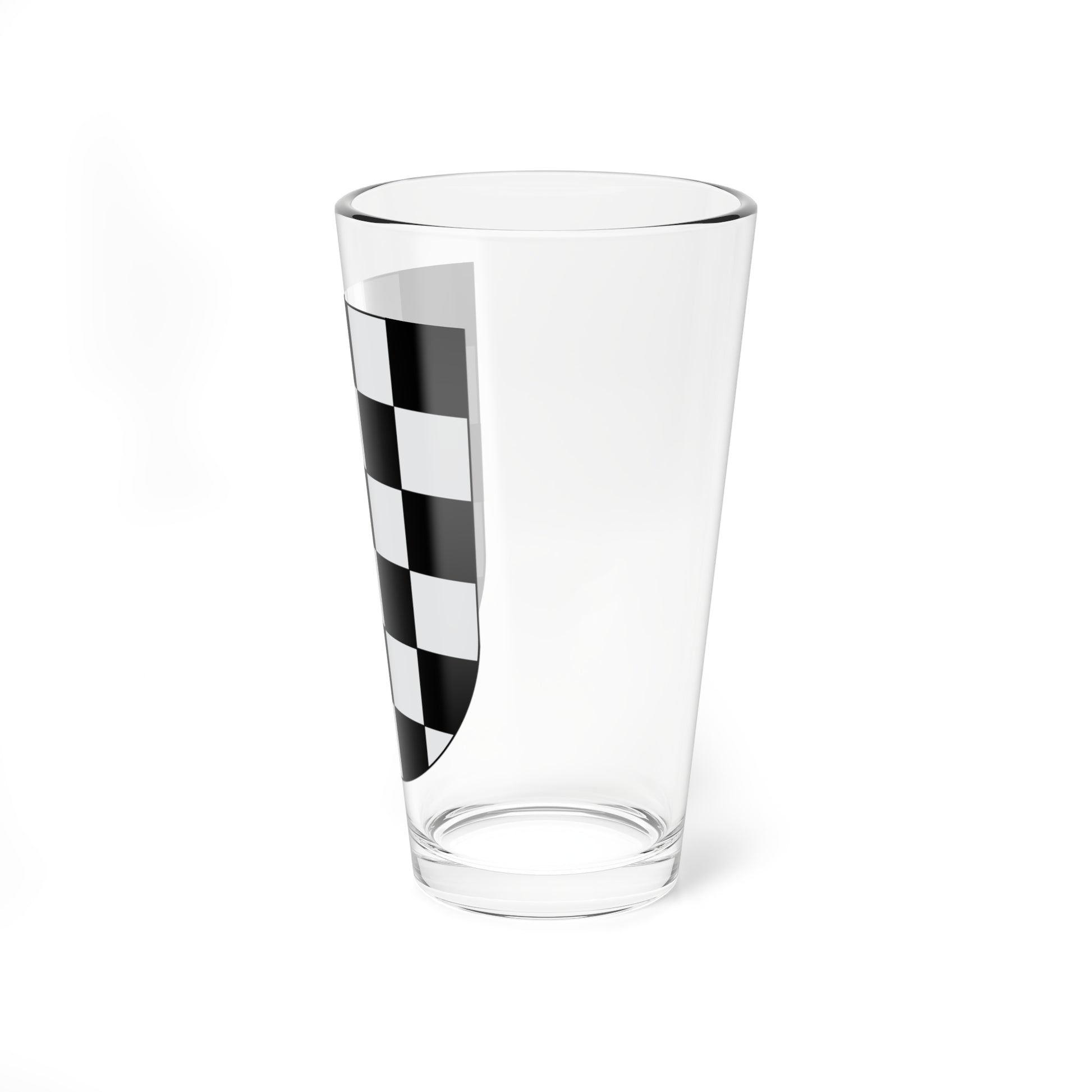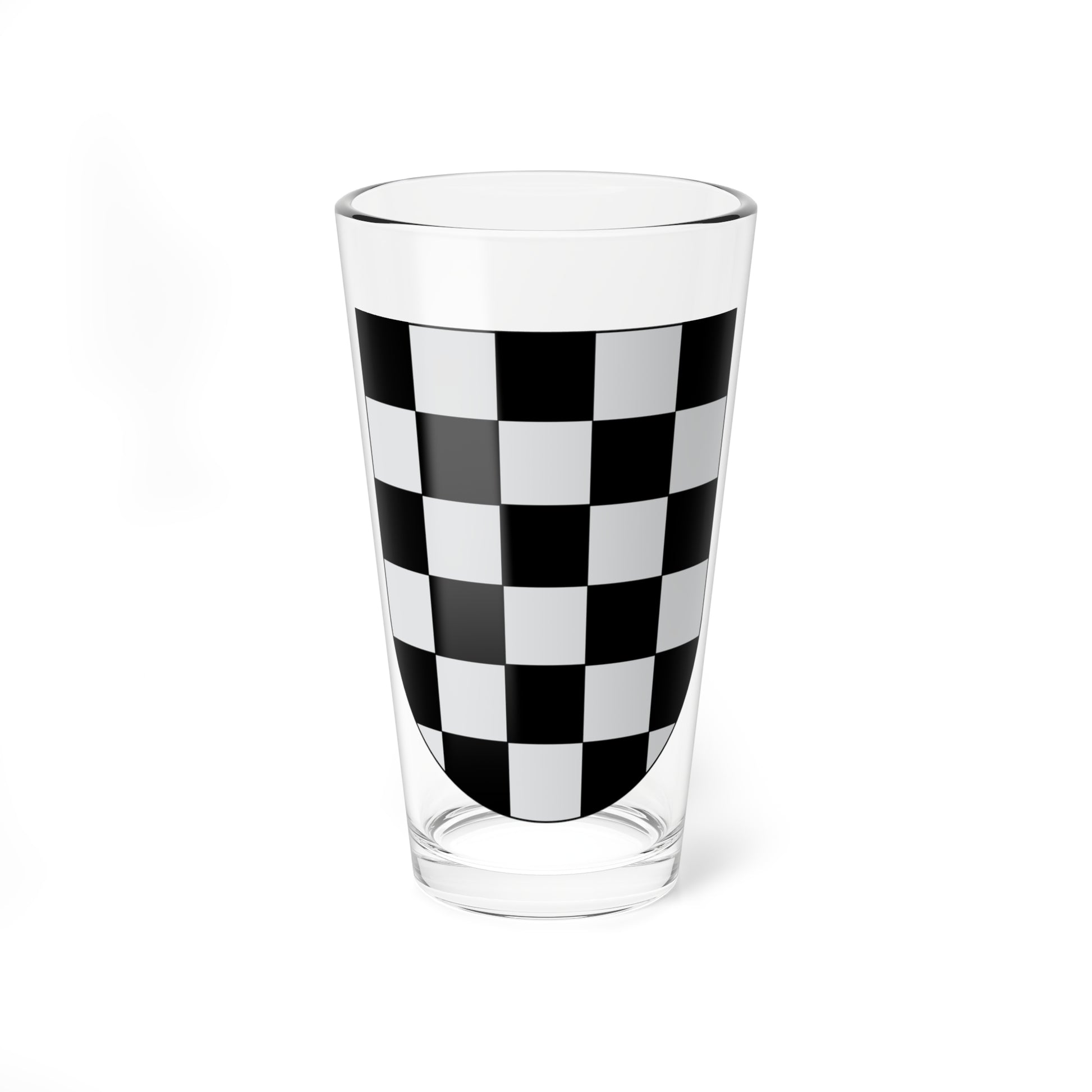 This pint glass showcases the iconic Escudo de Baztán, the coat of arms representing the Baztán Valley in Navarre, Spain. The design prominently features a classic chequy pattern, a grid composed of alternating black and white squares.