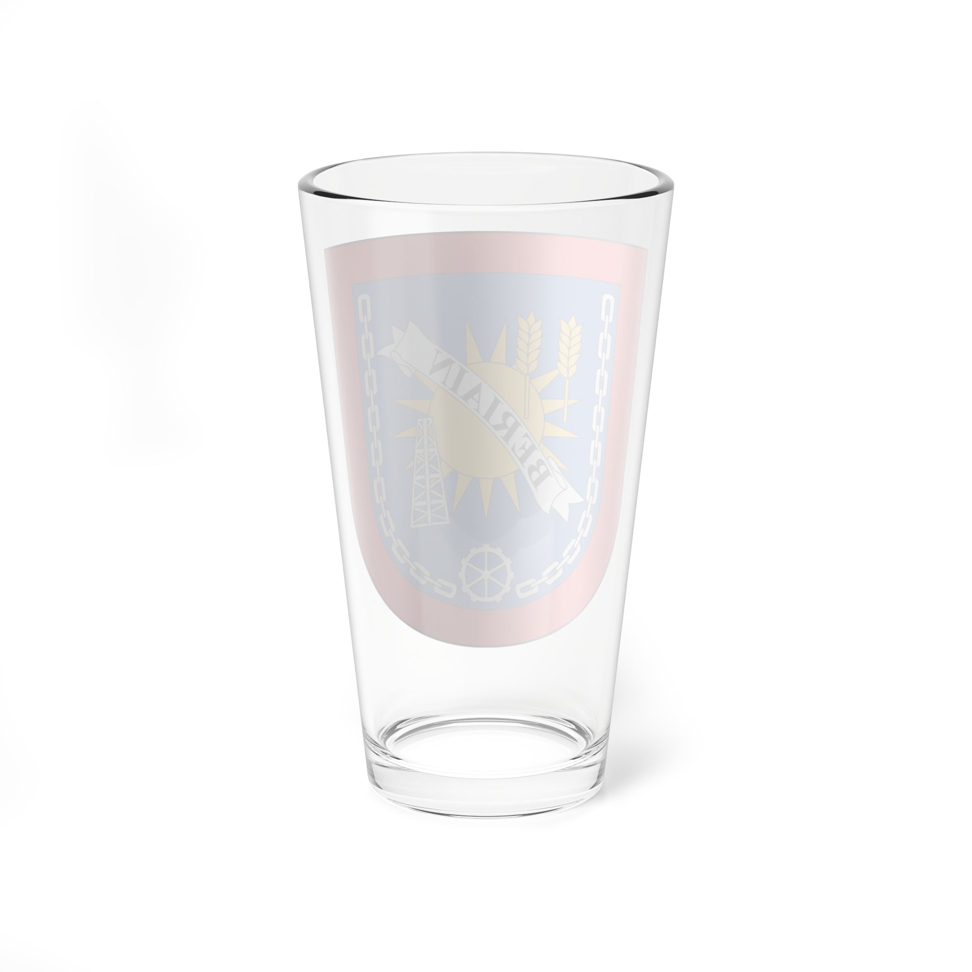 Raise a glass to the heritage of Beriáin, Spain, with this stunning pint glass showcasing the municipality's official coat of arms. The design is a vibrant tapestry woven with symbolic elements, each contributing to the rich narrative of Beriáin's past and present.