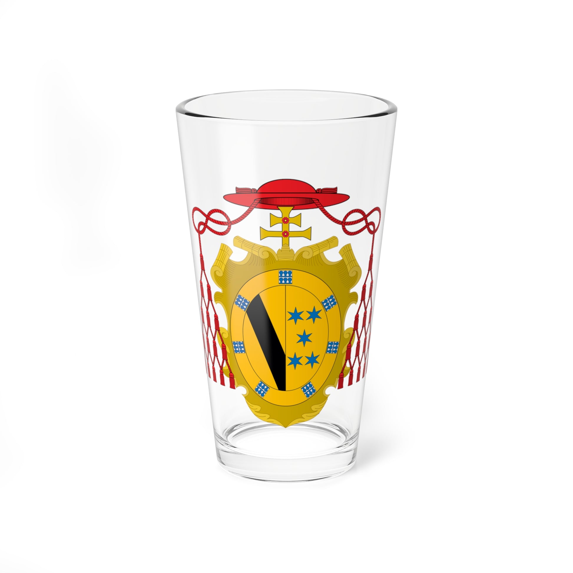 This pint glass showcases the heraldic emblem of Bernardo de Sandoval y Rojas, a Cardinal, Archbishop of Toledo, and Grand Inquisitor of Spain. The design is a vibrant testament to his lineage and high ecclesiastical rank, offering a compelling visual narrative.
