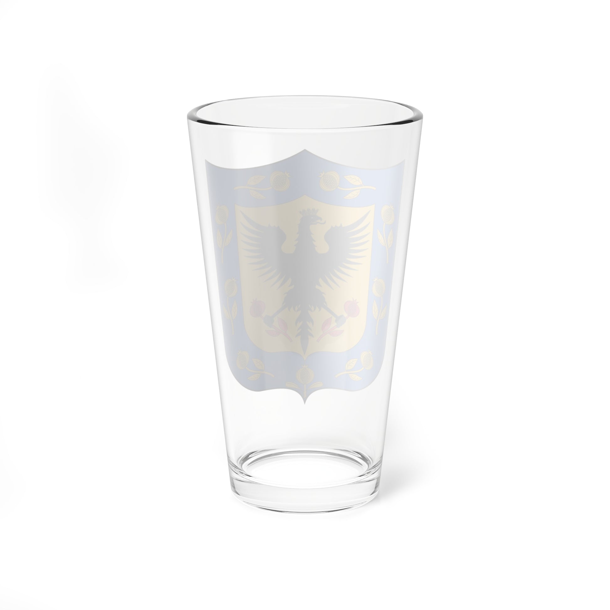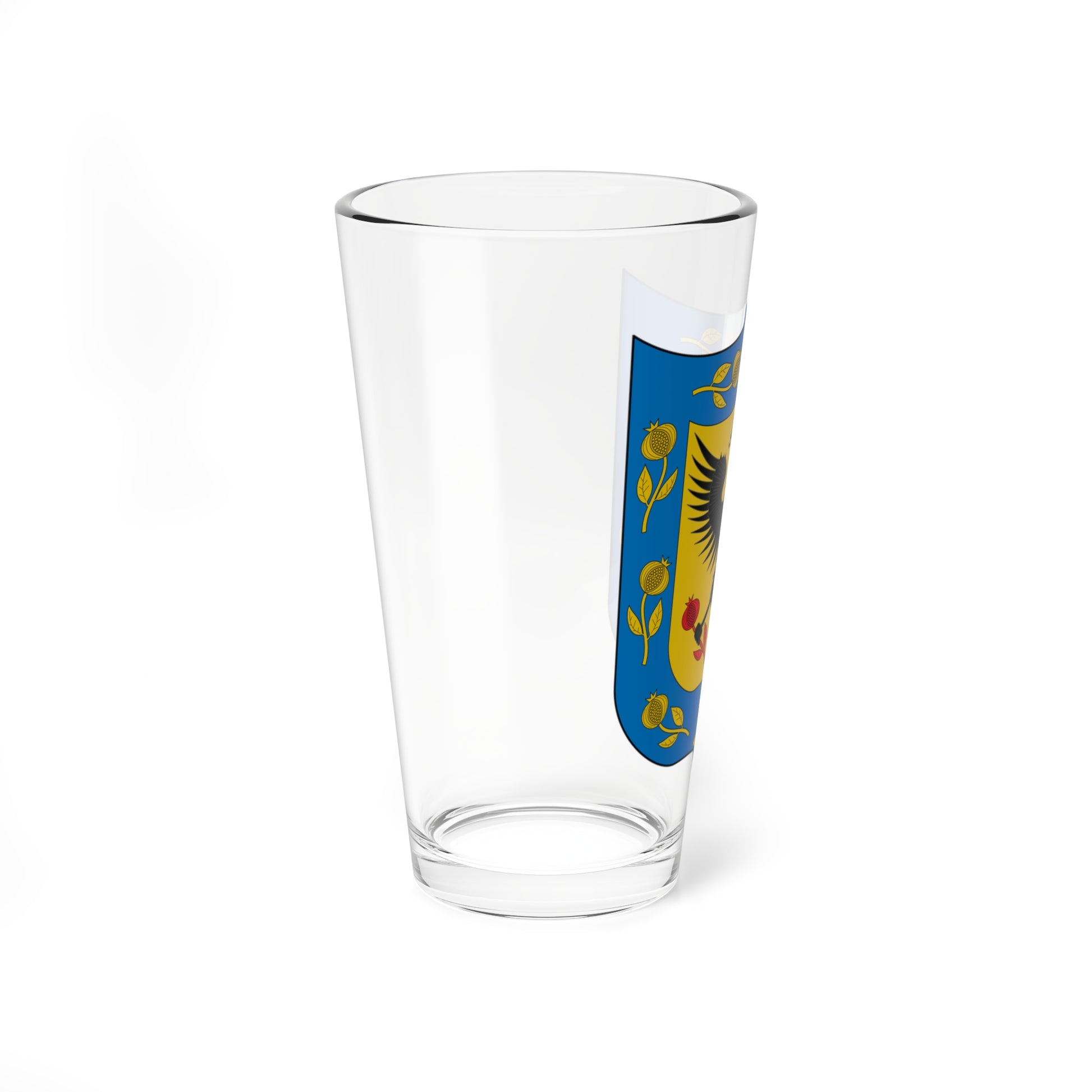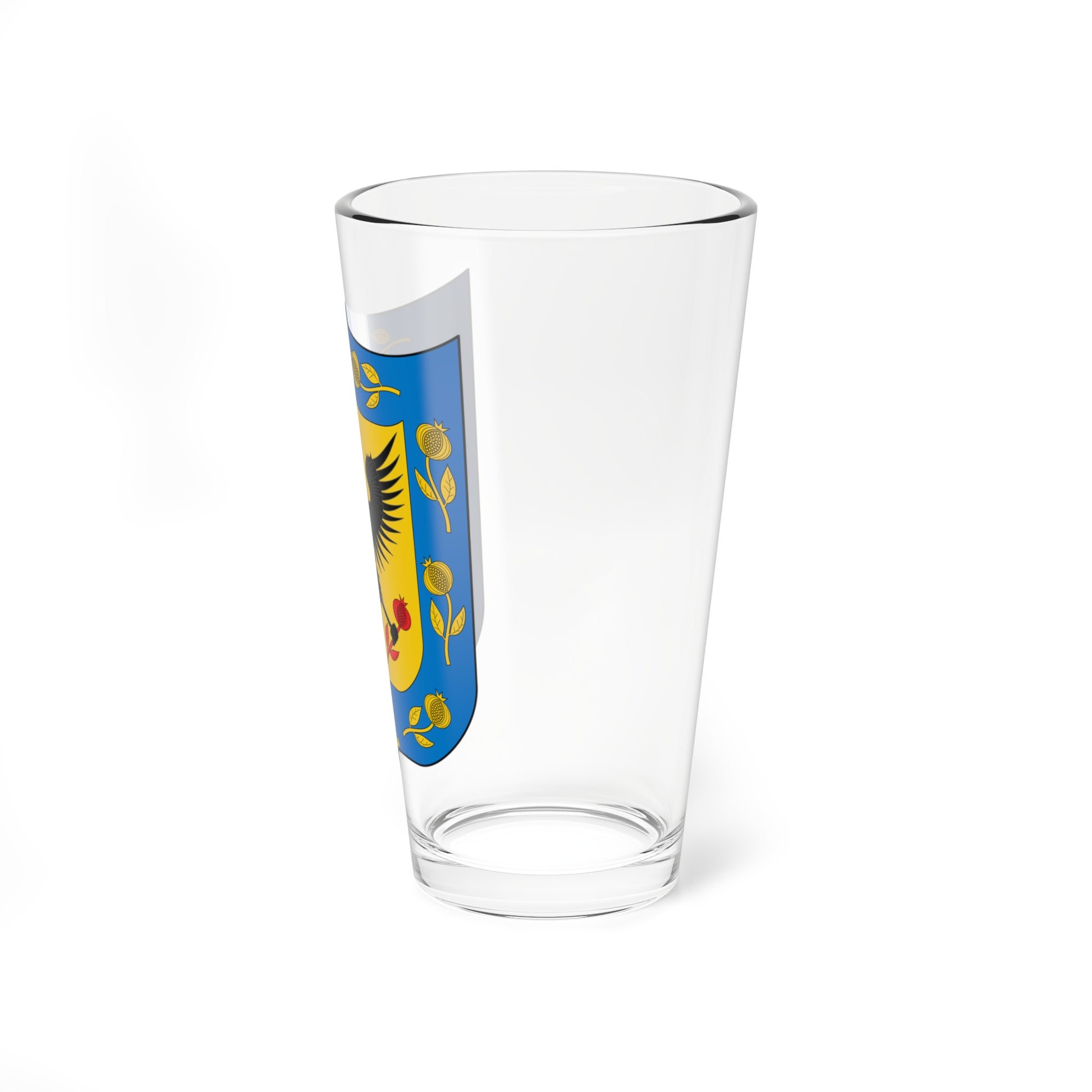 This pint glass showcases the majestic , the Coat of Arms of the Colombian capital. The design immediately captures the eye with its striking central elements.