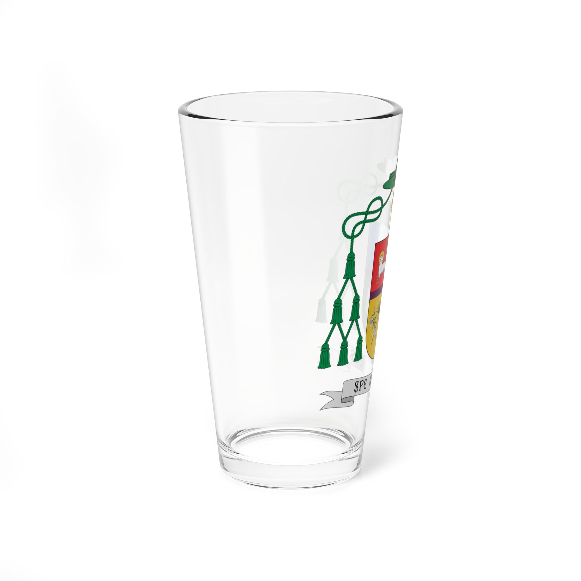 This pint glass showcases the heraldic artistry of the "Escudo de Carlos Francisco de Assis Gabriel dos Santos," the personal coat of arms of a Brazilian Catholic bishop. The design is a vibrant testament to episcopal heraldry, a visual language rich in symbolism.