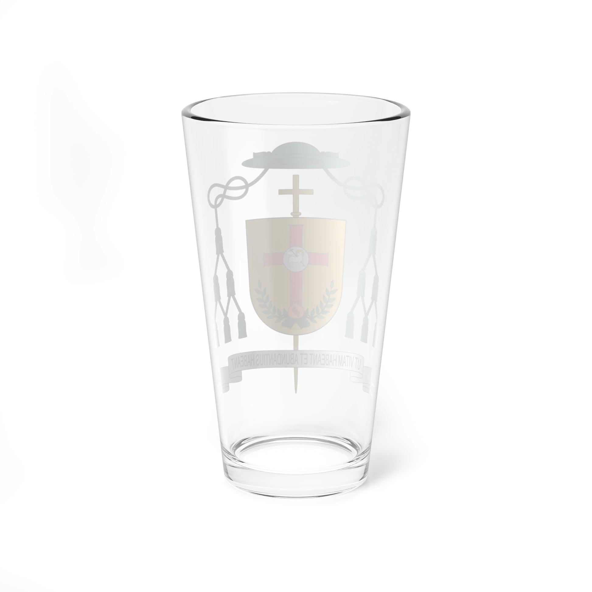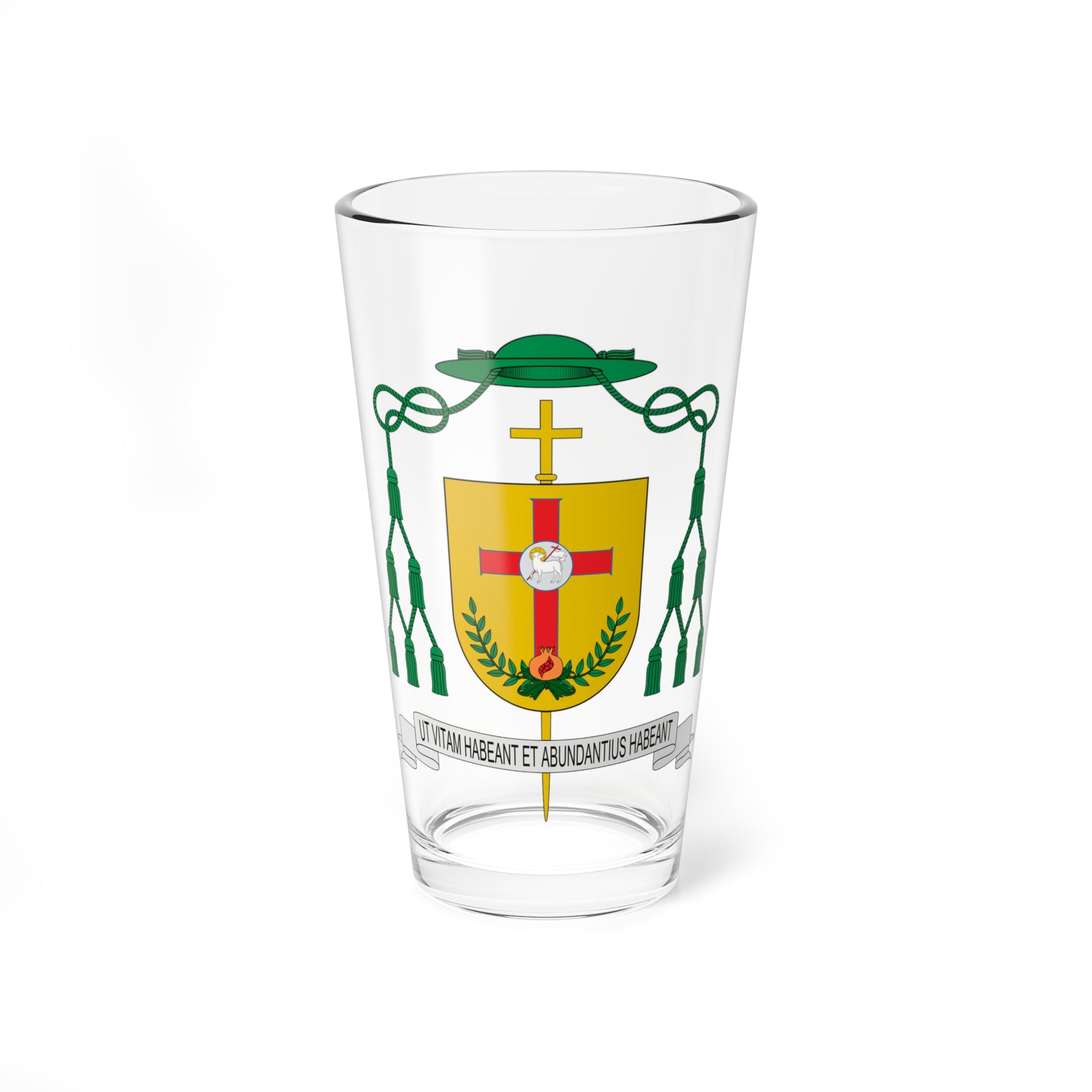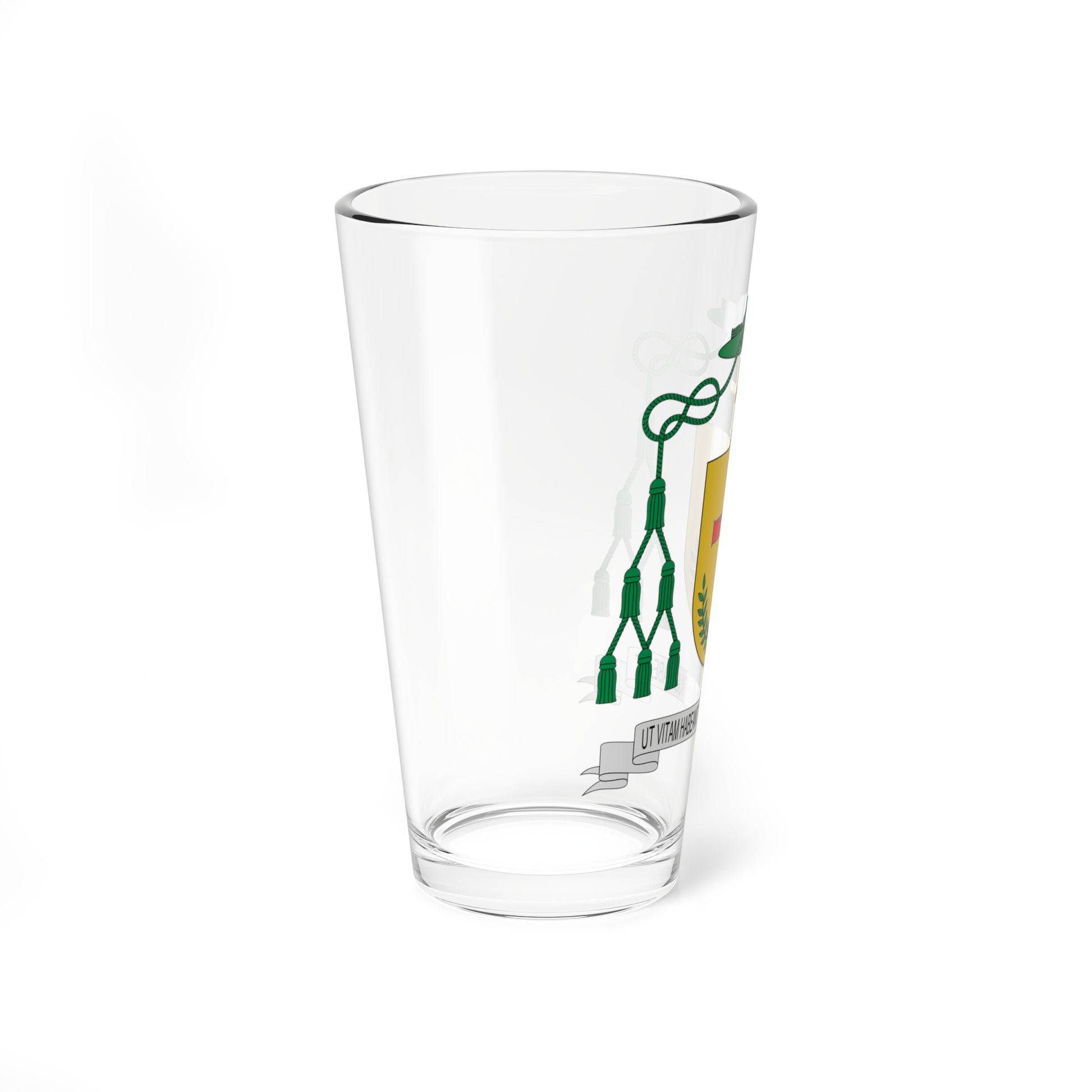 This pint glass showcases the heraldic achievement of César Augusto Franco Martínez, formerly the Bishop of Segovia, Spain. The design, crafted by heraldist Macucal, is rich in symbolism, reflecting Bishop Franco Martínez's ecclesiastical role and pastoral mission.