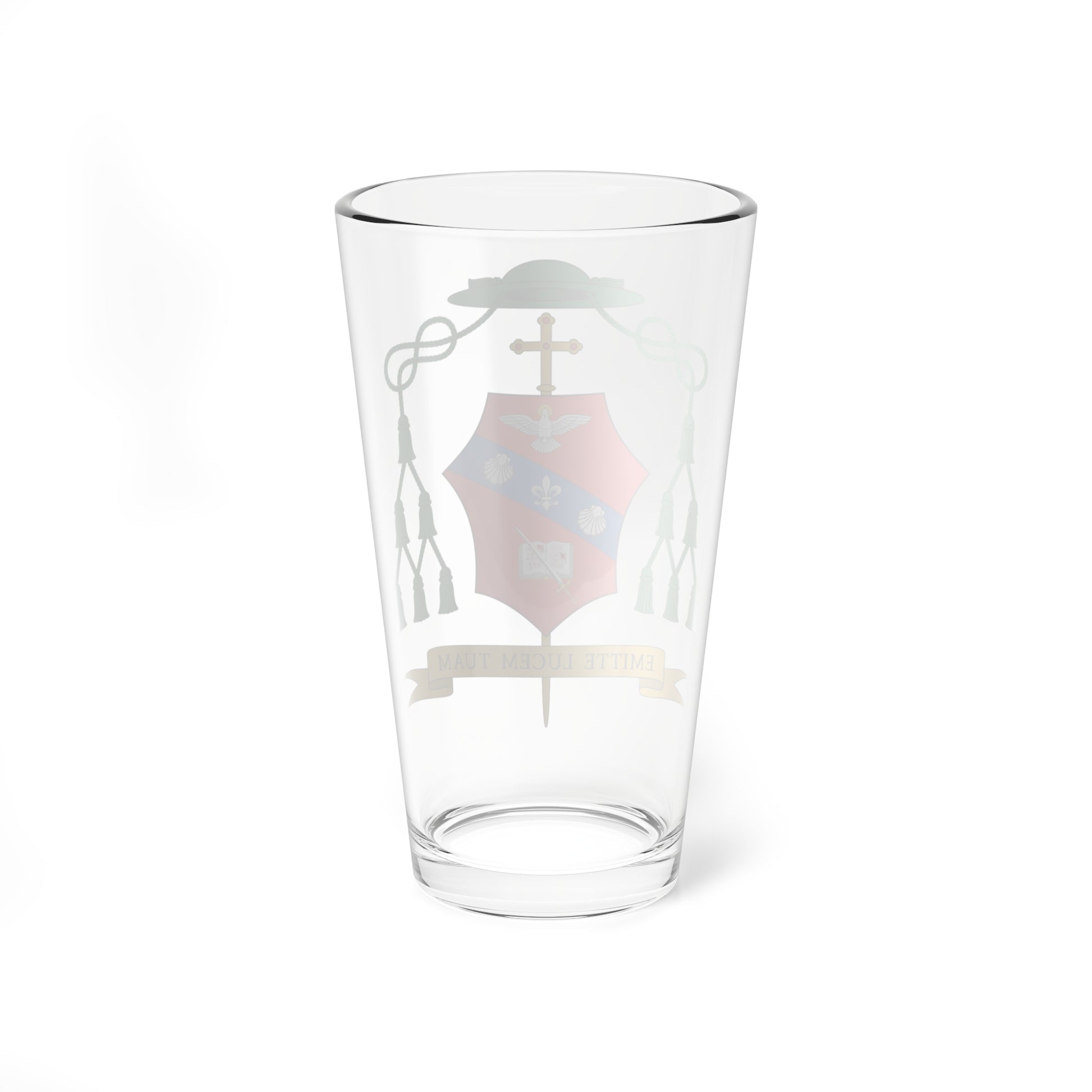 This pint glass showcases the heraldic design of the Escudo de Cícero Alves de França, the ecclesiastical coat of arms of Dom Cícero Alves de França, Auxiliary Bishop of São Paulo. The artwork, a vibrant and symbolic representation of faith and pastoral service, is rendered with meticulous detail.