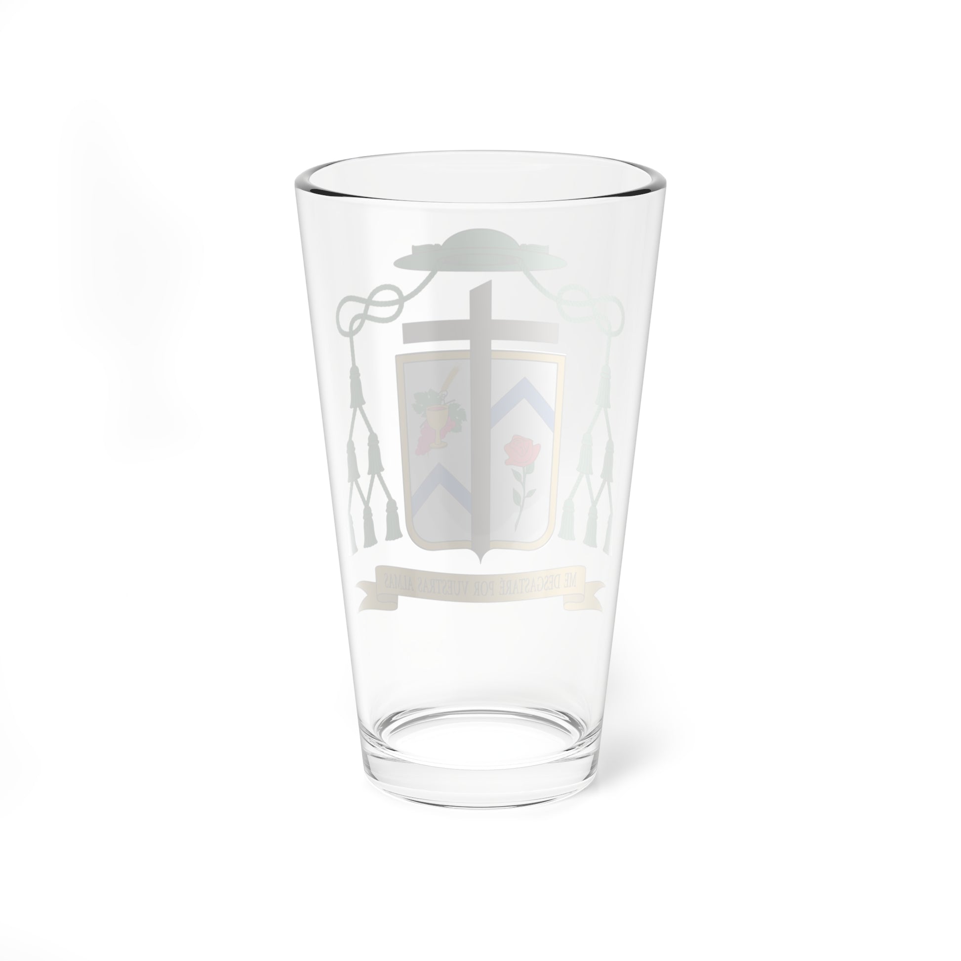This pint glass showcases the heraldic design of the Coat of Arms of Monsignor Cipriano García Fernández, a Spanish Augustinian priest and former Bishop Prelate of Cafayate, Argentina. The artwork is rich with symbolism reflecting his faith, service, and the region he served.