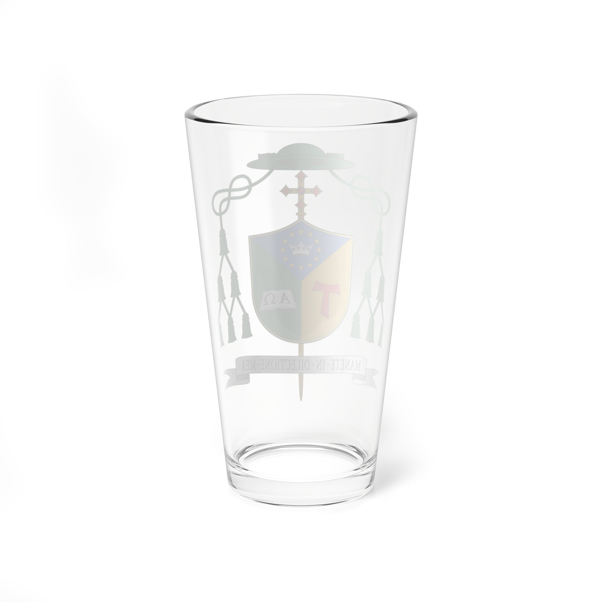 This pint glass showcases the "Escudo de Cláudio Nori Sturm," the episcopal coat of arms of Dom Frei Cláudio Nori Sturm, Bishop of the Diocese of Patos de Minas, Brazil. The design is a rich tapestry of Franciscan symbolism and pastoral meaning.