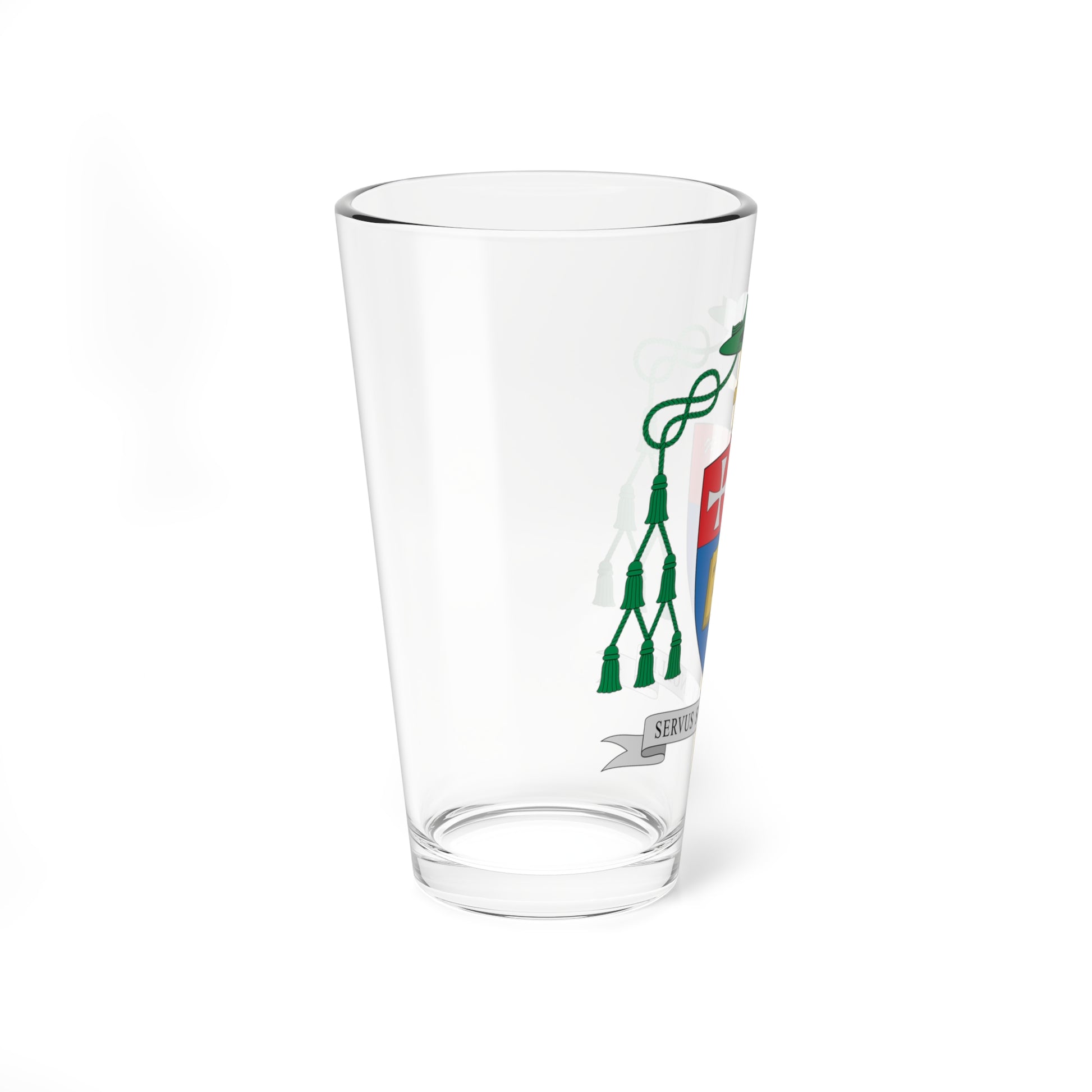 This pint glass showcases the heraldic achievement of David Abadías Aurín, Auxiliary Bishop of Barcelona, a design officially published in July 2024. The artwork meticulously renders the bishop's Coat of Arms, a powerful visual representation of his identity and faith.