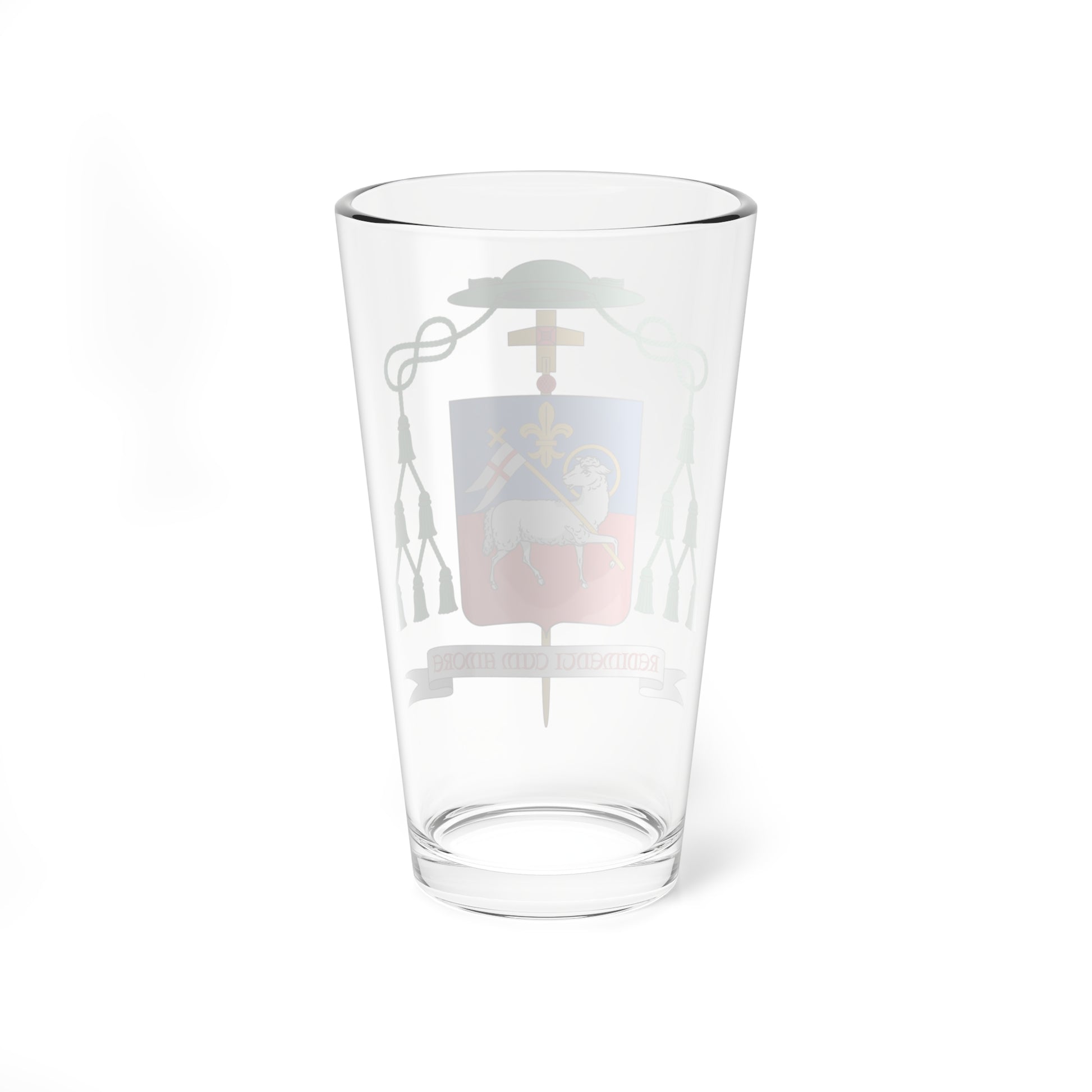 This pint glass showcases an elegant and meaningful coat of arms, the Escudo de Dominique Marie Jean Denis You. The design is a sophisticated piece of ecclesiastical heraldry, rich in symbolism and historical context.