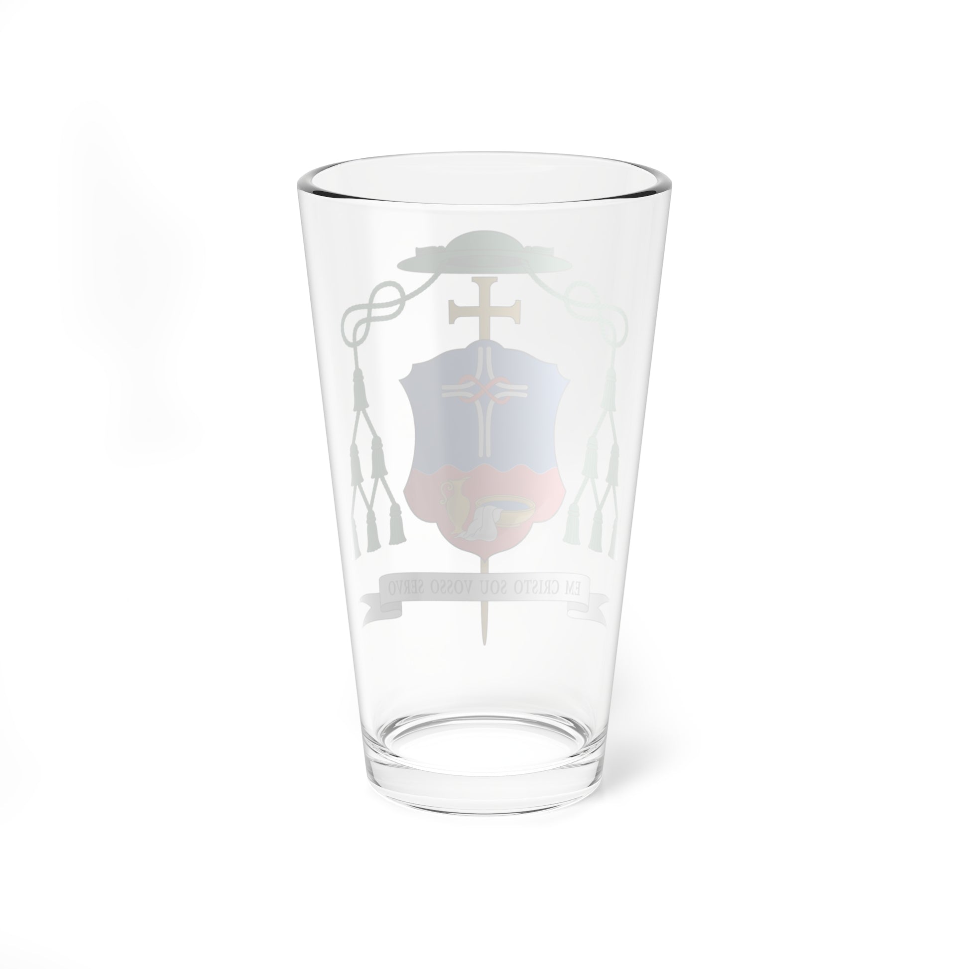 This pint glass showcases the stunning Escudo de Edgar Xavier Ertl, the personal coat of arms of a Brazilian Catholic Bishop. However, it's important to note that the term "Spain" in the product name refers to the *style* of heraldry, not the origin of the design itself. This is an ecclesiastical coat of arms, bearing the symbolism of the Bishop's faith and office.