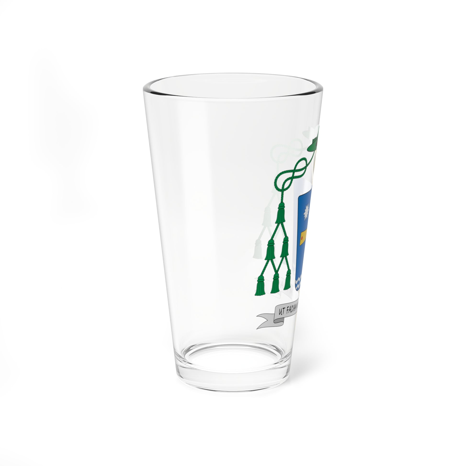 This pint glass showcases the heraldic artistry of the "Escudo de Edmar Peron," a coat of arms belonging to Edmar Peron, a Brazilian Catholic bishop. The design is a striking representation of ecclesiastical symbolism, meticulously crafted for visual impact.