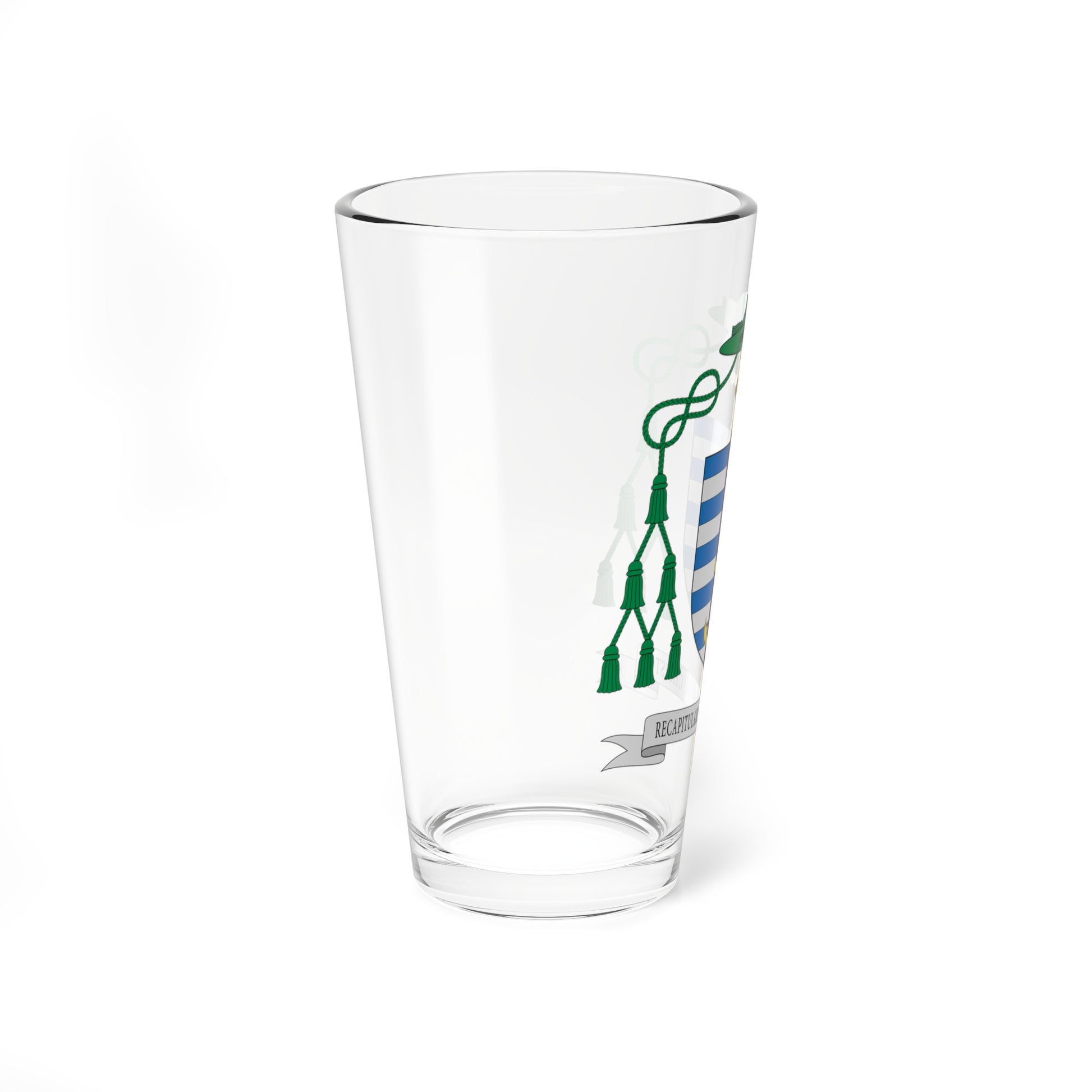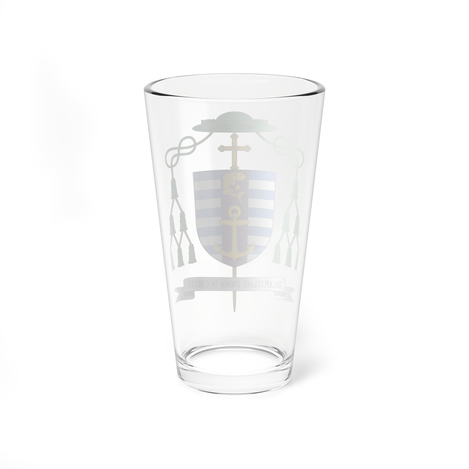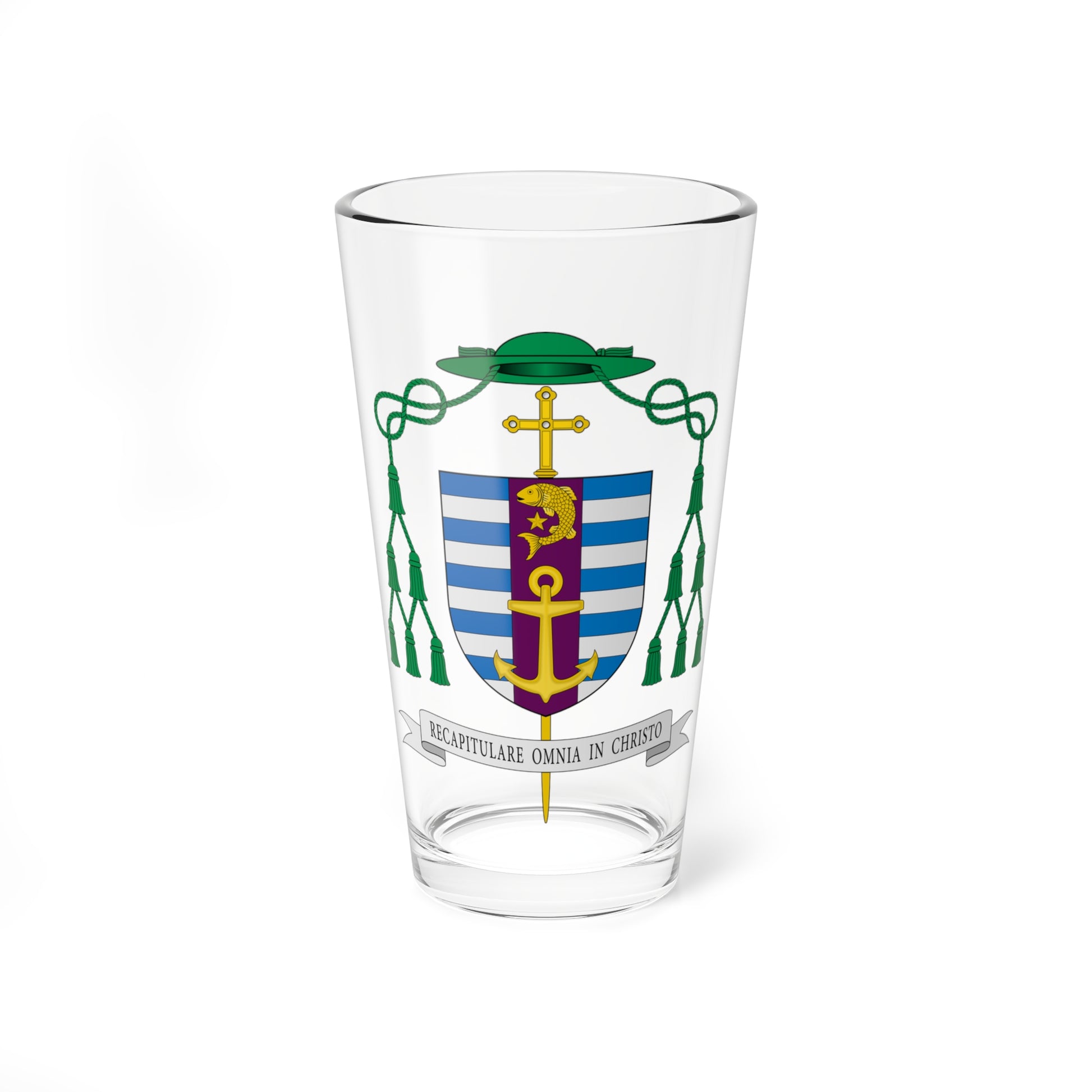 This pint glass showcases the "Escudo de Edmilson Tadeu Canavarros dos Santos," the episcopal coat of arms of Dom Edmilson Tadeu Canavarros dos Santos, Prelate of the Territorial Prelature of Itacoatiara, in the Amazon, Brazil.