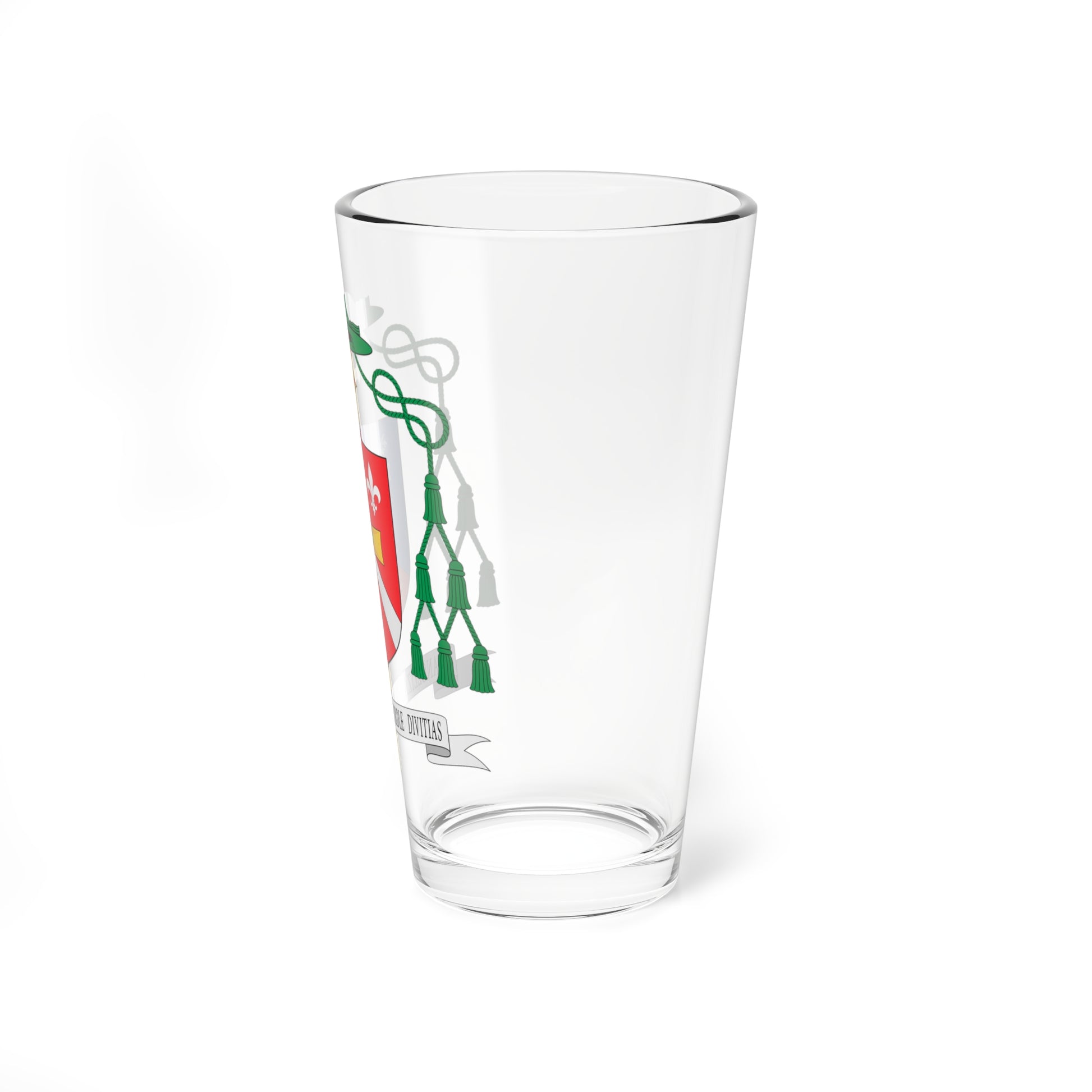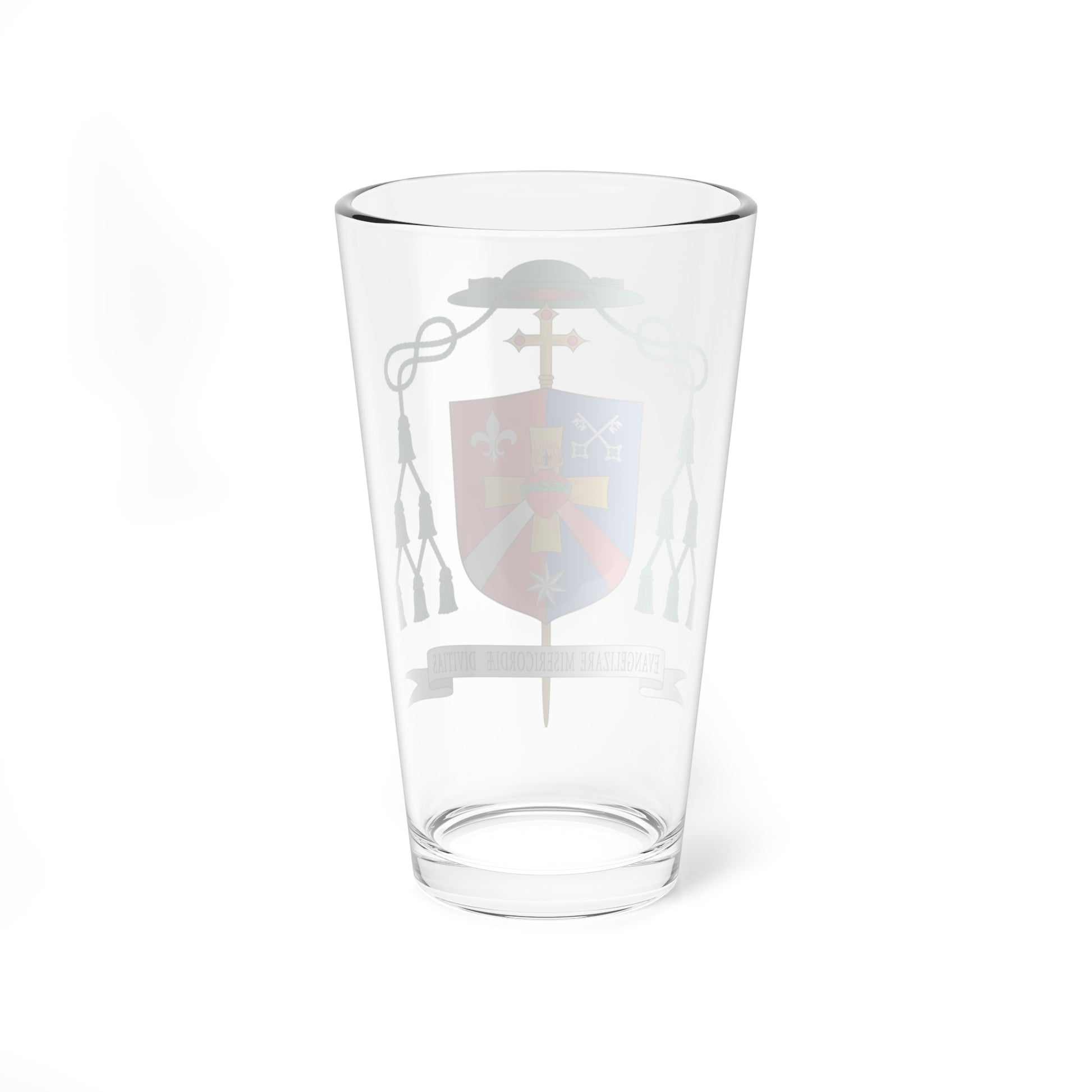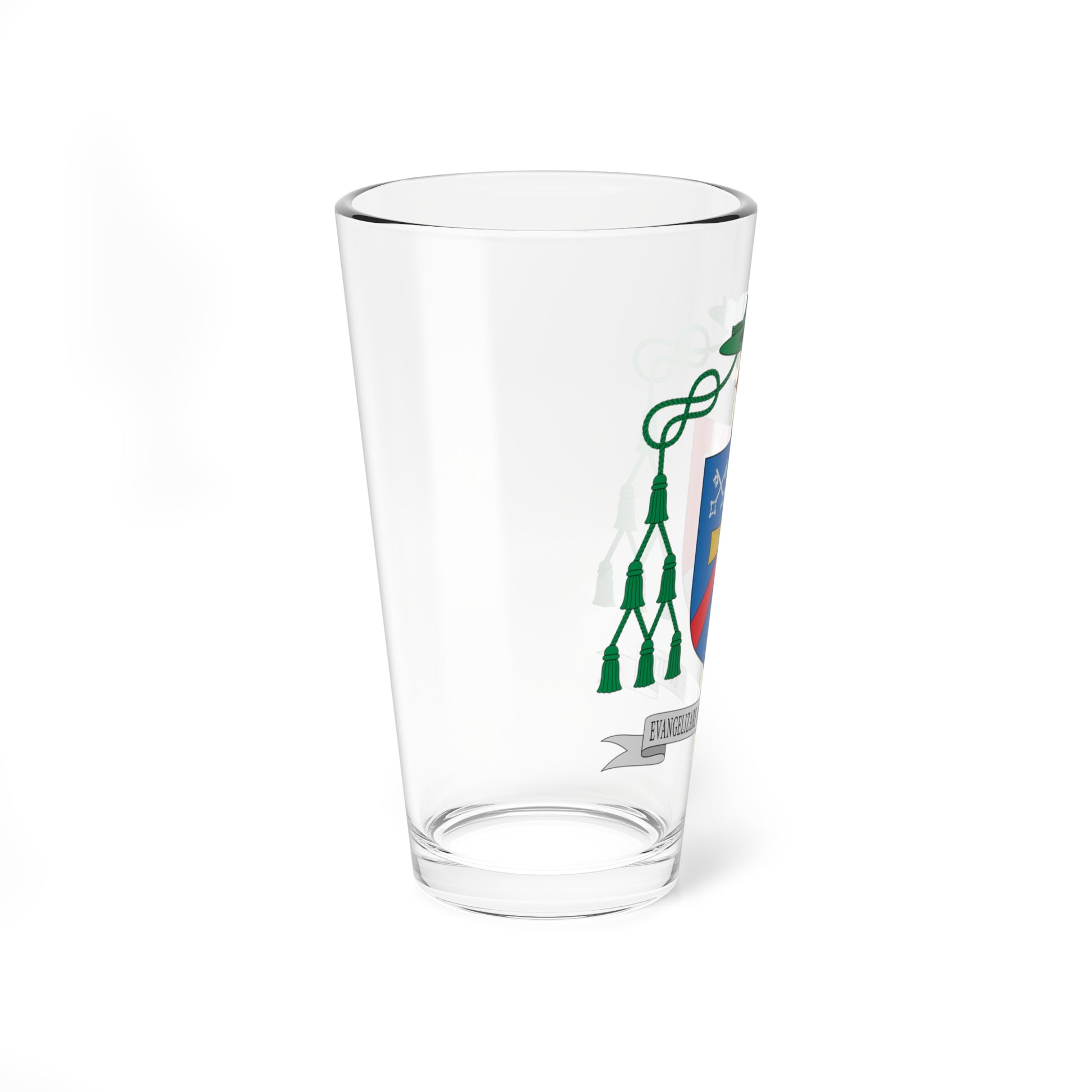 This pint glass showcases the striking coat of arms of Bishop Edson José Oriolo dos Santos, a powerful visual statement of faith and mission.
