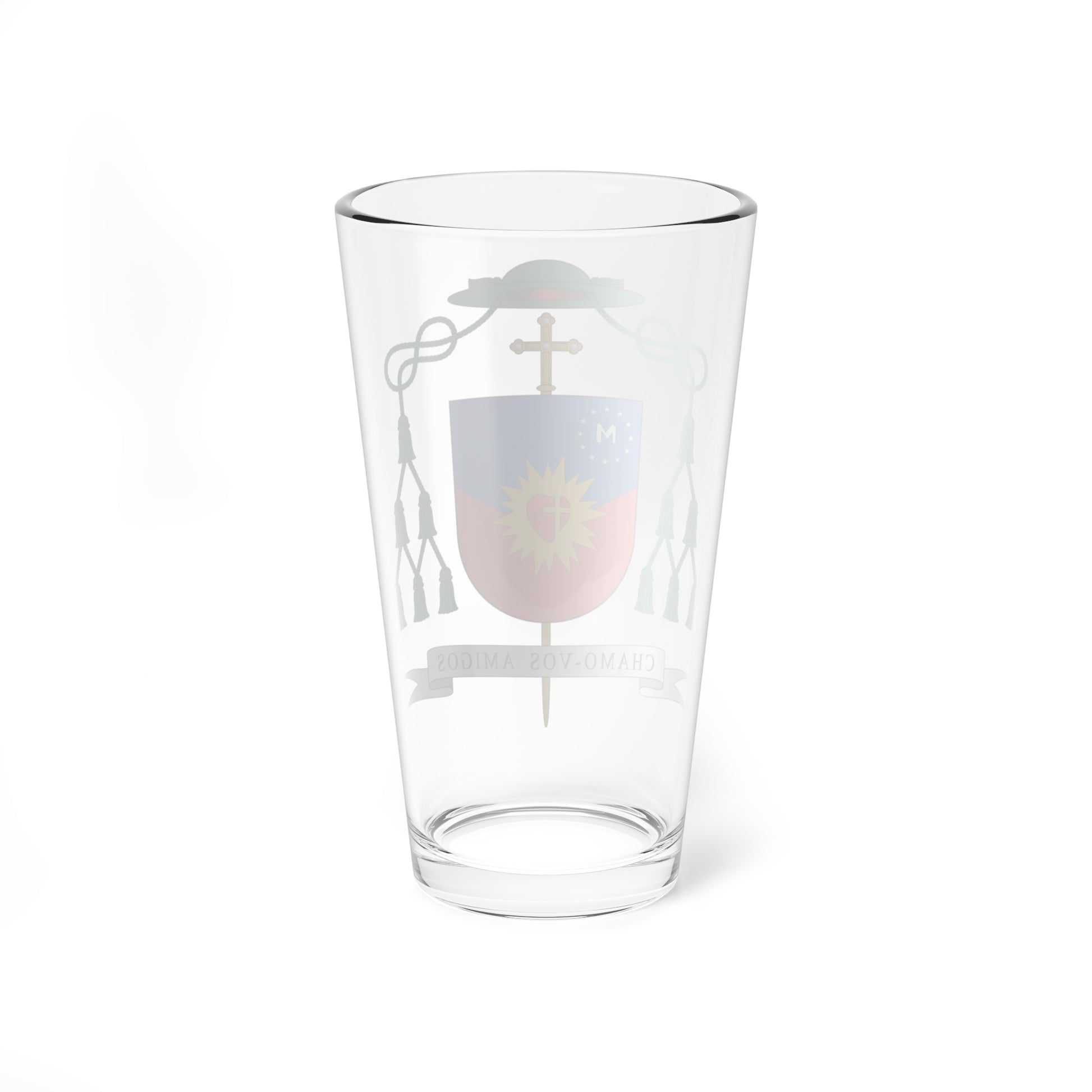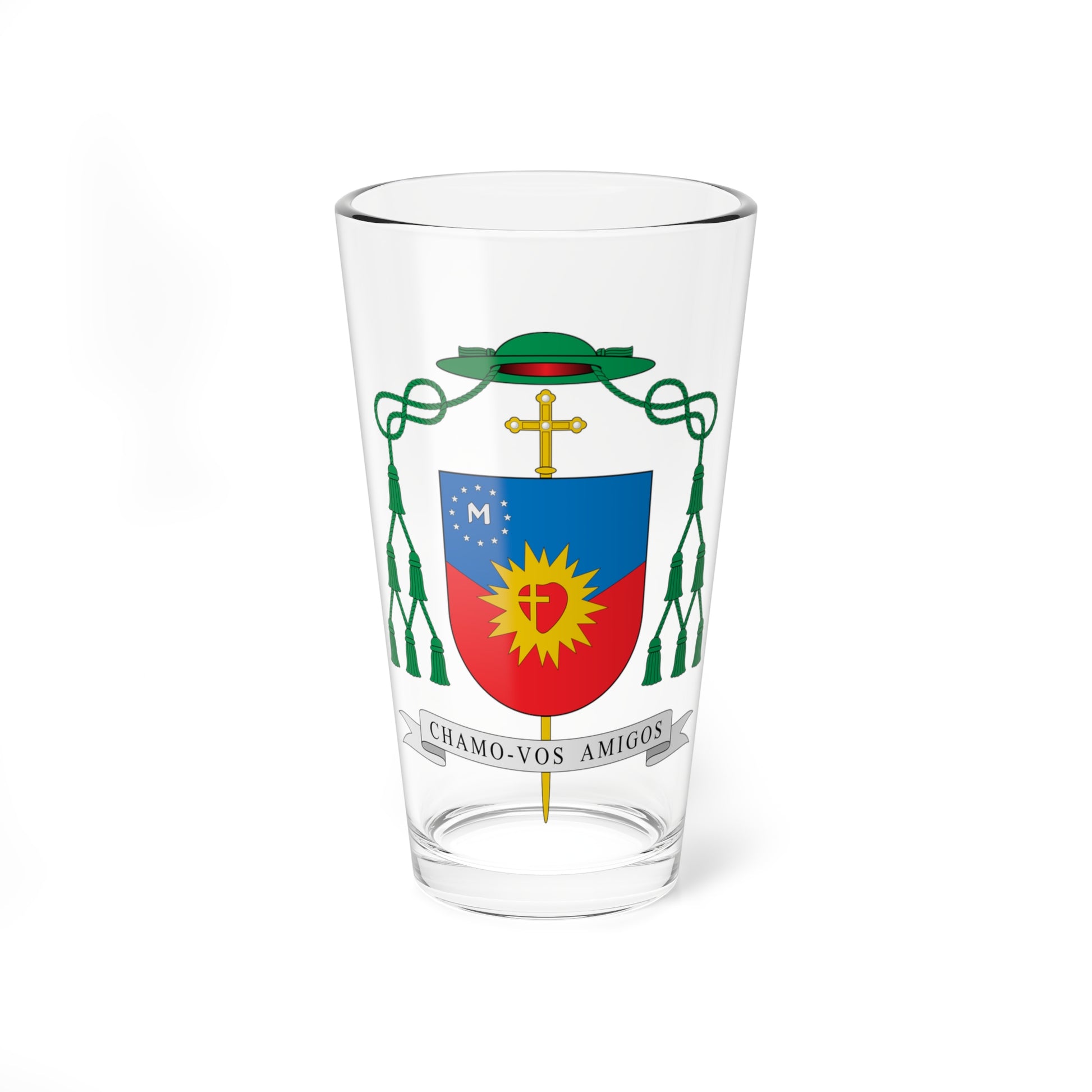 This pint glass showcases the "Escudo de Eduardo Pinheiro da Silva," the heraldic emblem of Bishop Eduardo Pinheiro da Silva, currently leading the Diocese of Jaboticabal. The design, crafted by the artist Macucal, is a striking representation of traditional episcopal symbolism.