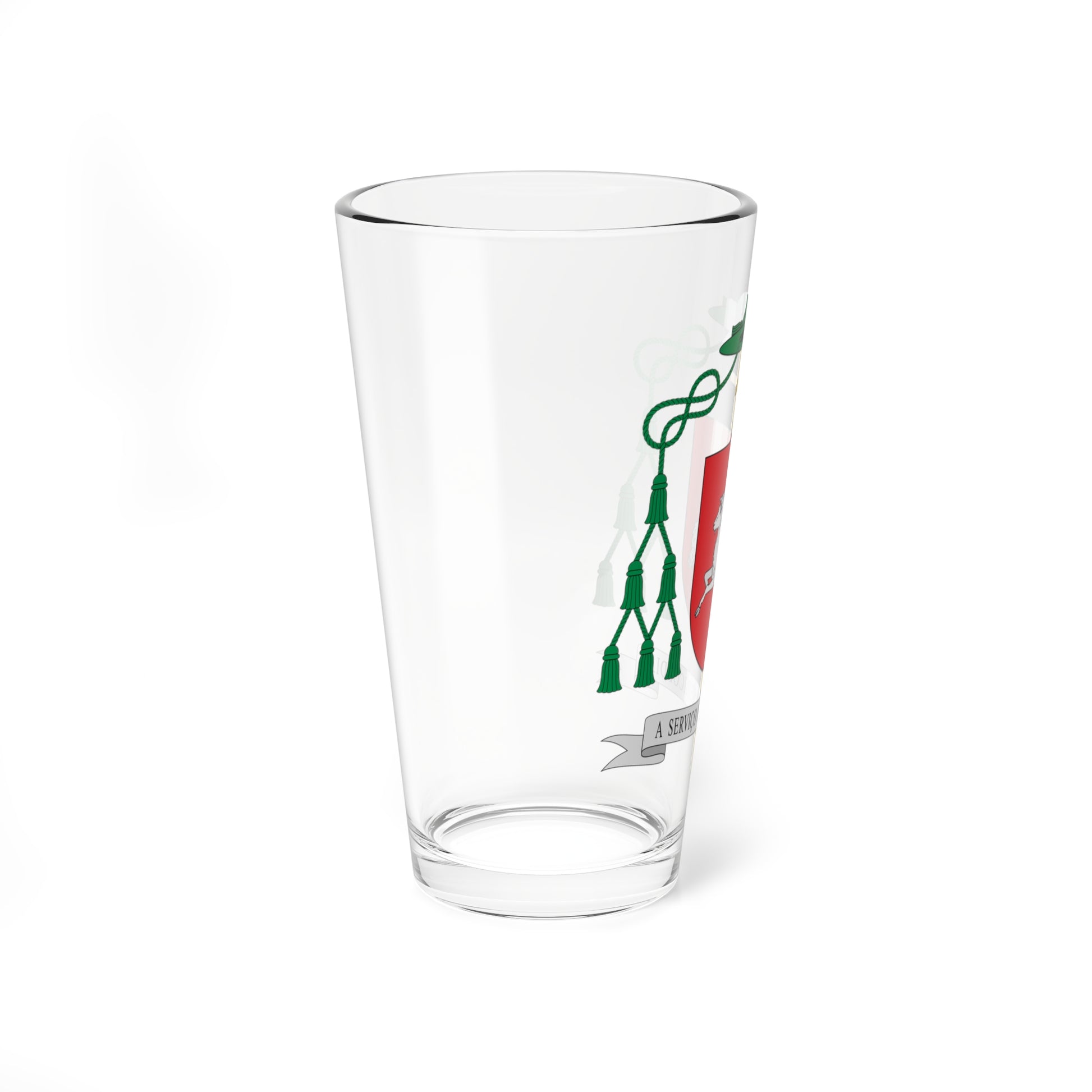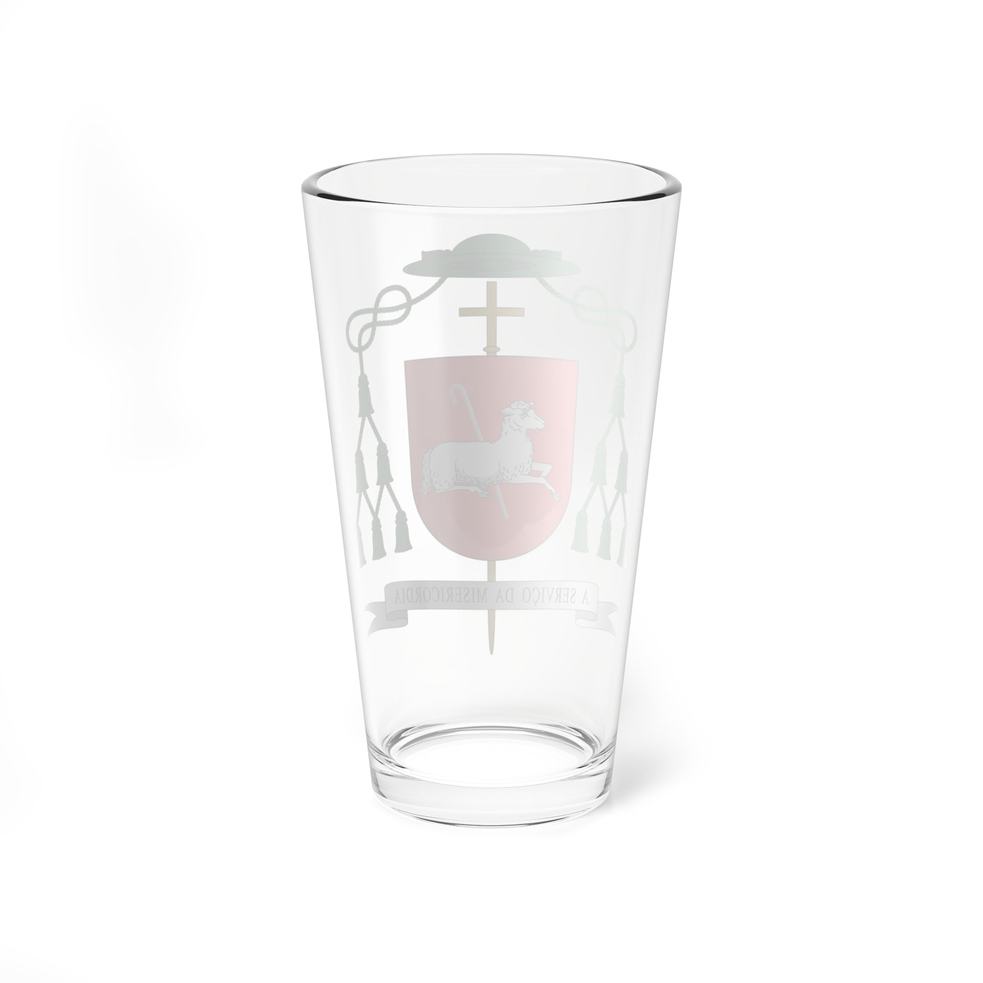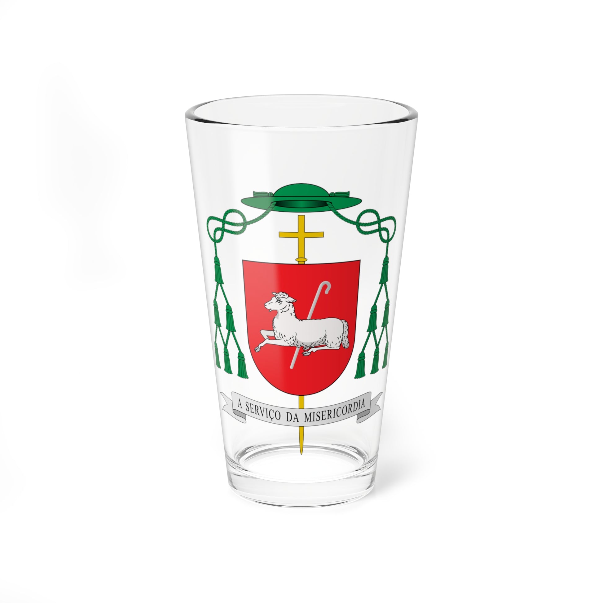 This pint glass features the elegant coat of arms of Dom Emanuel Messias de Oliveira, former Bishop of the Diocese of Caratinga in Brazil. The design is a powerful visual statement of faith and service, meticulously crafted to represent the Bishop's episcopal identity.