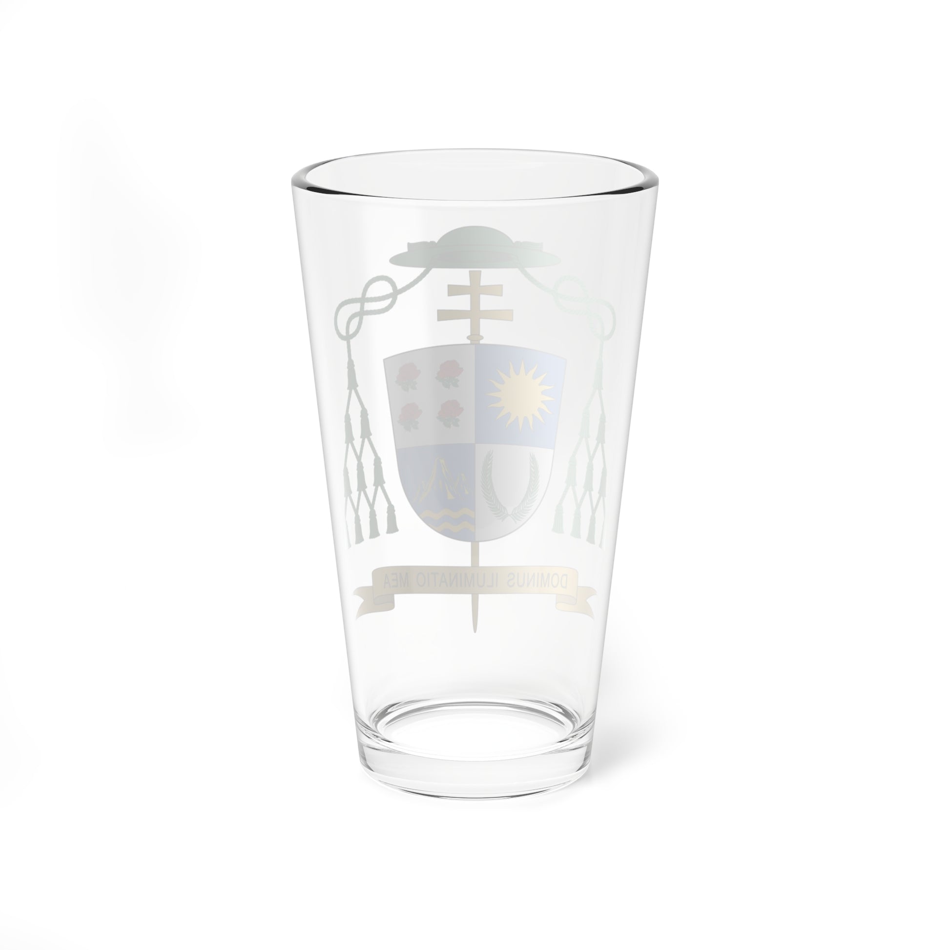 This pint glass showcases the striking coat of arms, or "Escudo," of Archbishop Paul Tschang In-Nam, a prominent figure in the Catholic Church. The design is a visual testament to his life and mission, rendered with meticulous detail and rich symbolism.