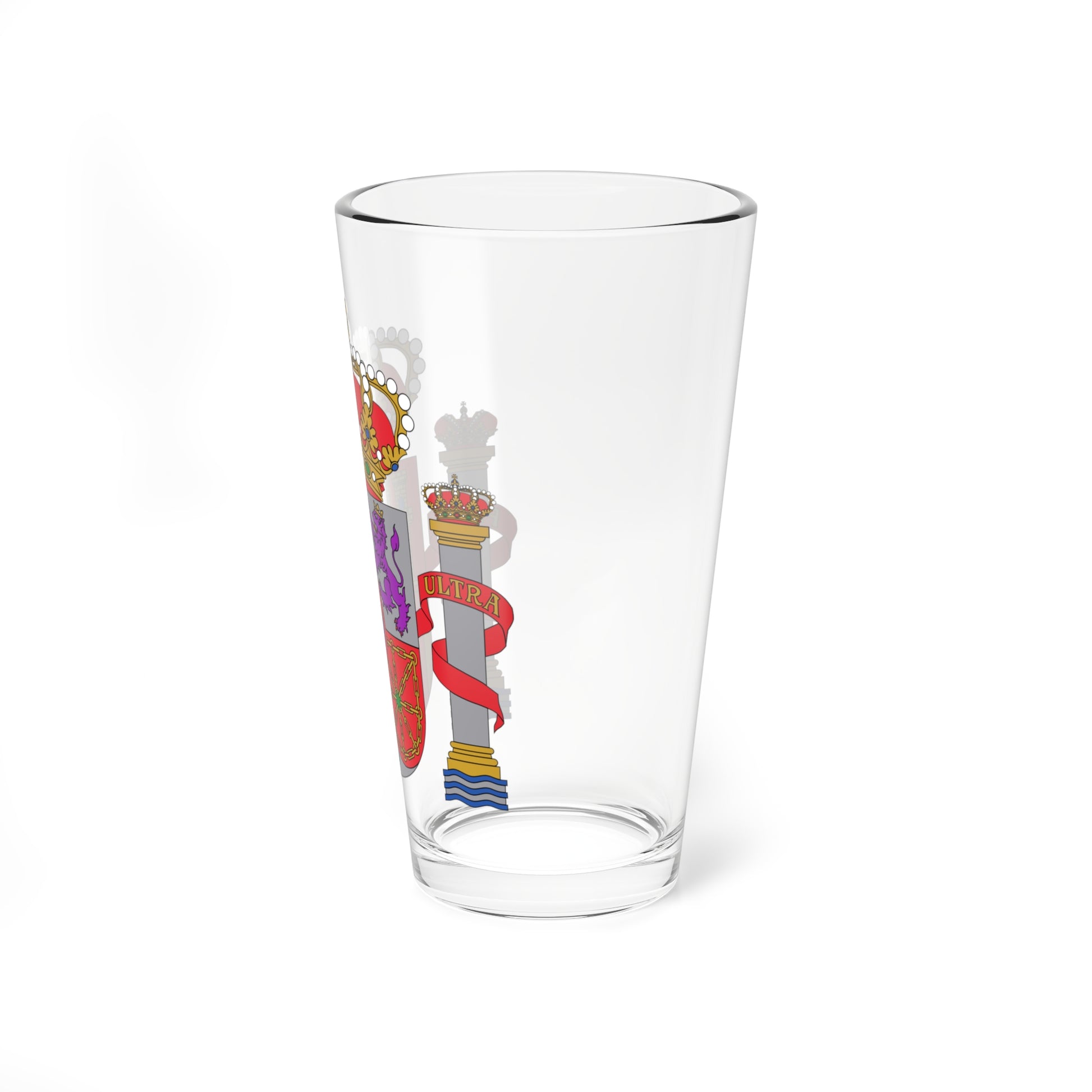 This pint glass showcases the "nuevo diseño" of the Spanish Coat of Arms, a powerful emblem of the nation's history and identity. The artwork meticulously replicates the officially standardized version, as defined by law.