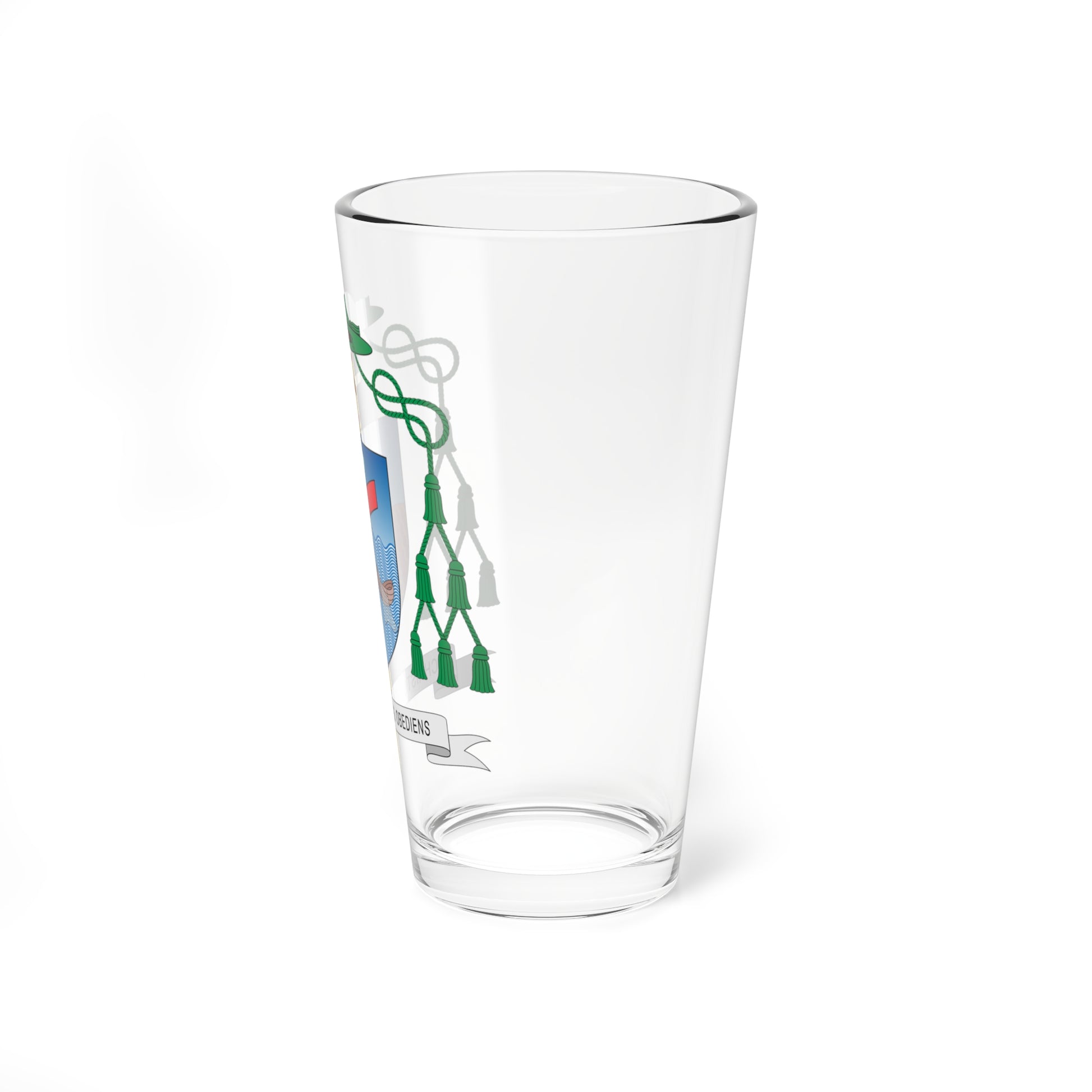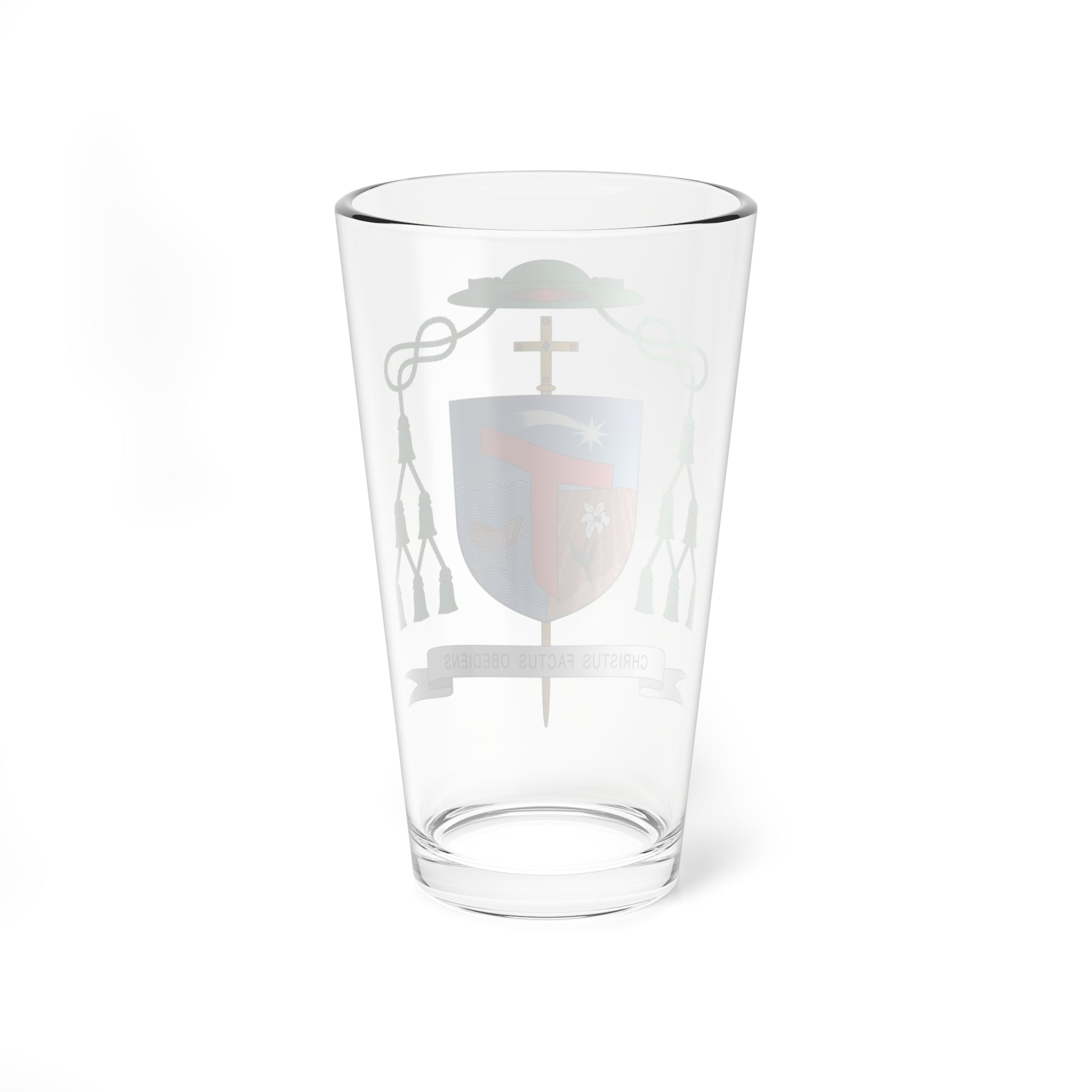 This pint glass showcases the heraldic achievement of Fernando Mason, a personal coat of arms rich in Christian symbolism and potential personal meanings. The design is a captivating visual representation of faith, service, and personal journey.