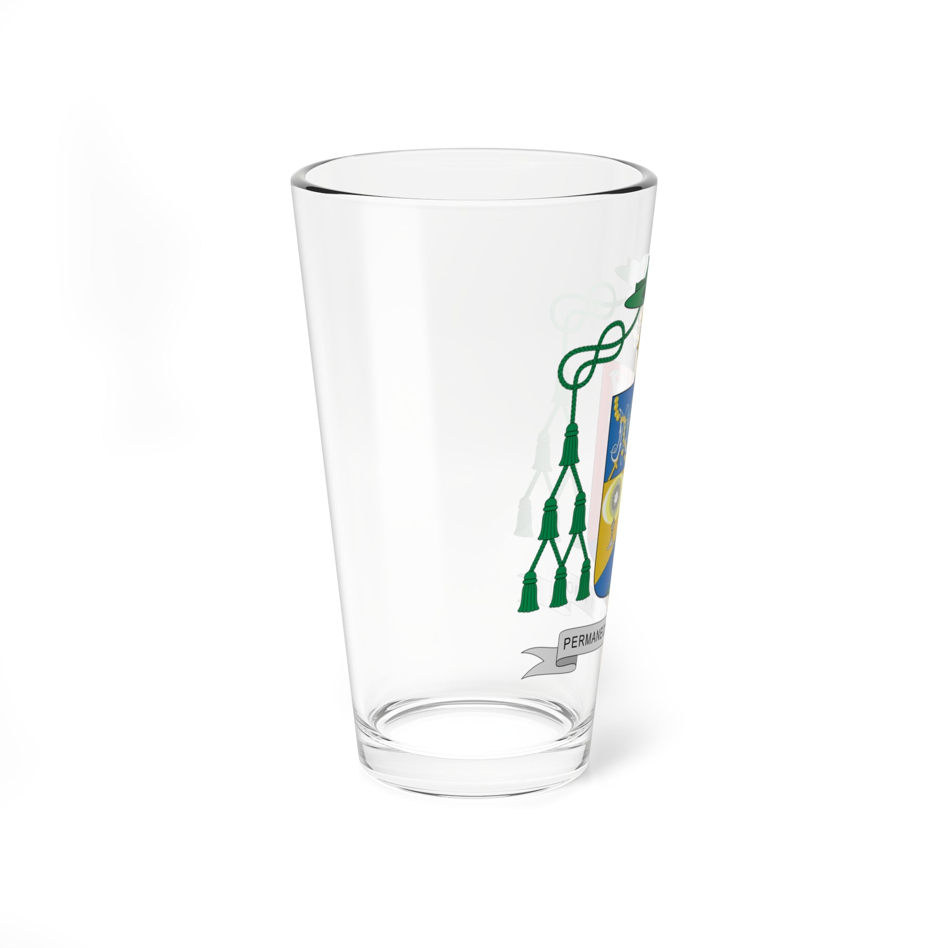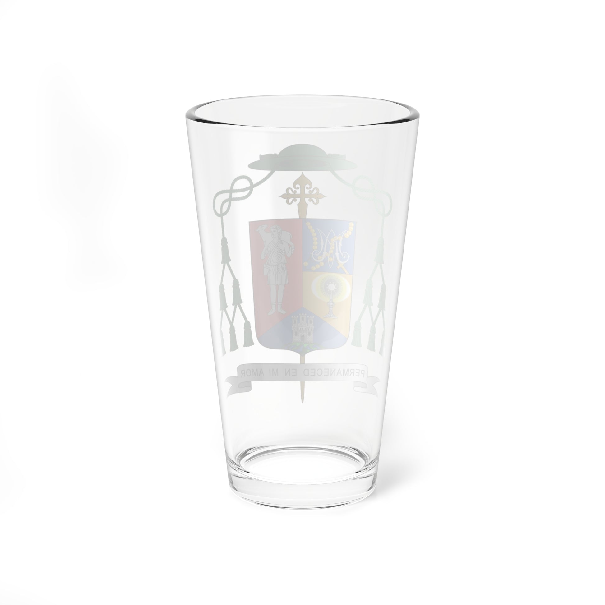 This pint glass features the beautifully rendered coat of arms of Bishop Fernando Valera Sánchez of Zamora, Spain. The design is a rich tapestry of religious and personal symbolism, meticulously arranged to tell the story of his faith, vocation, and origins.