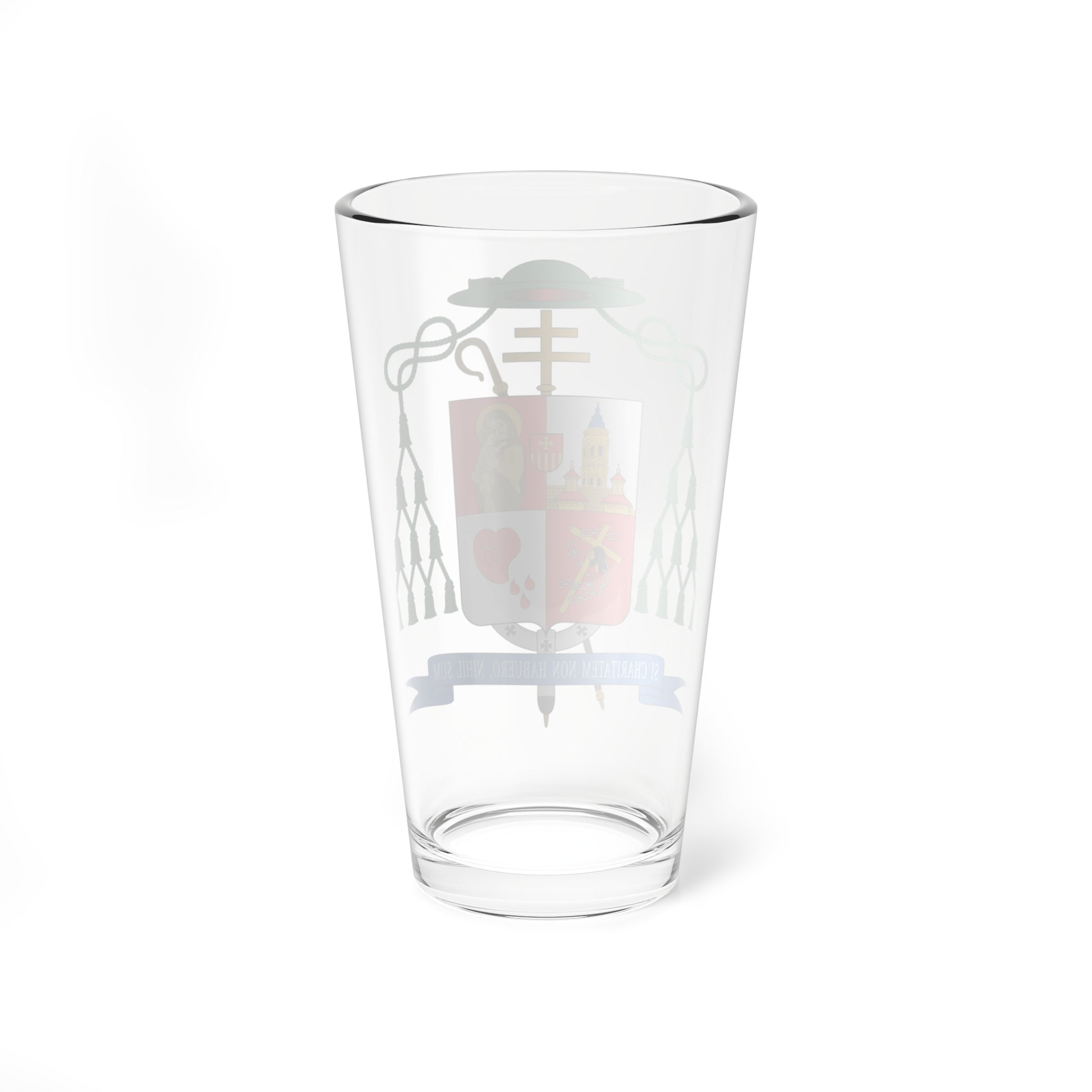 This pint glass features the intricate and meaningful design of the Escudo de Florencio Roselló Avellanas, the ecclesiastical coat of arms of the Archbishop of Pamplona and Tudela in Spain. The design is a powerful visual representation of his faith, origins, and pastoral mission.