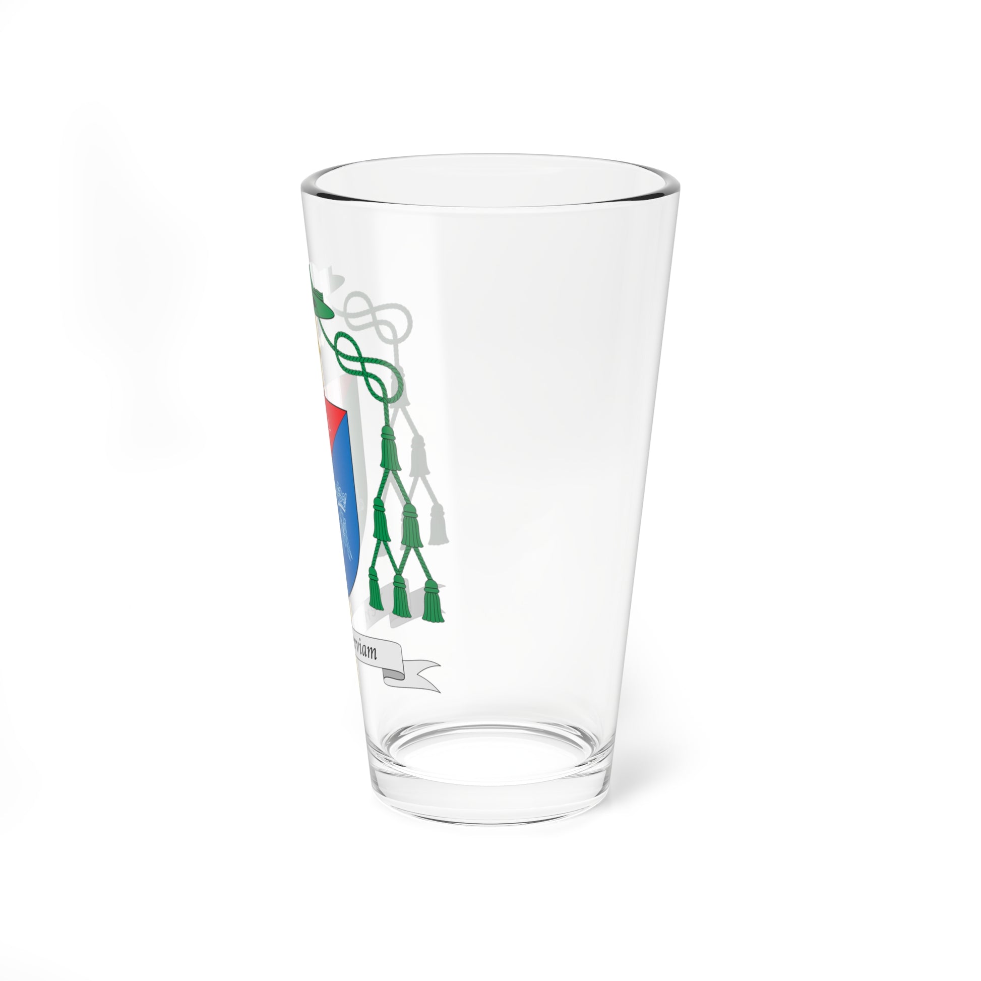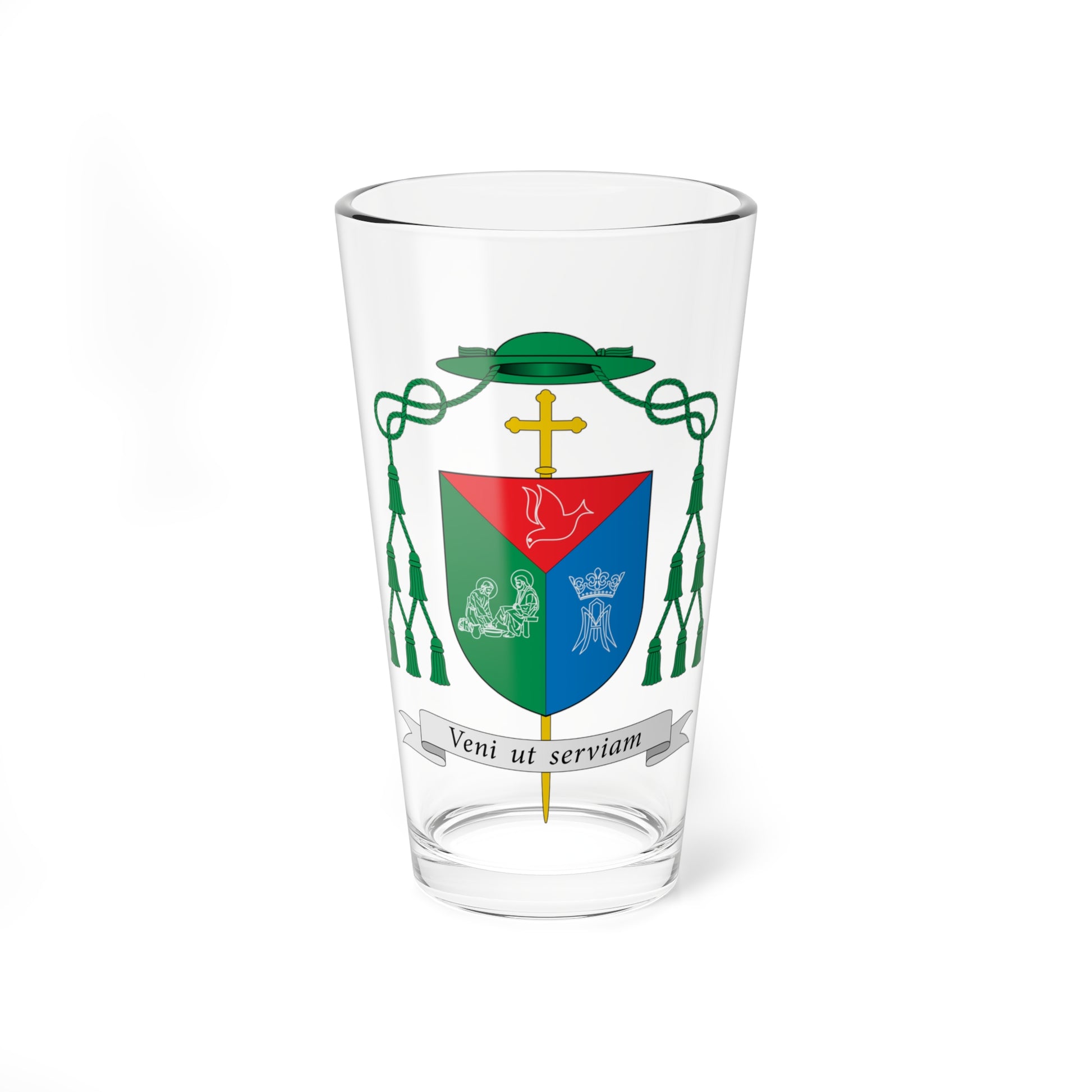 This pint glass showcases the heraldic design of the Escudo de Francisco Cota de Oliveira, a coat of arms associated with an ecclesiastical figure, likely a bishop. The design is rich with religious symbolism and traditional heraldic elements.