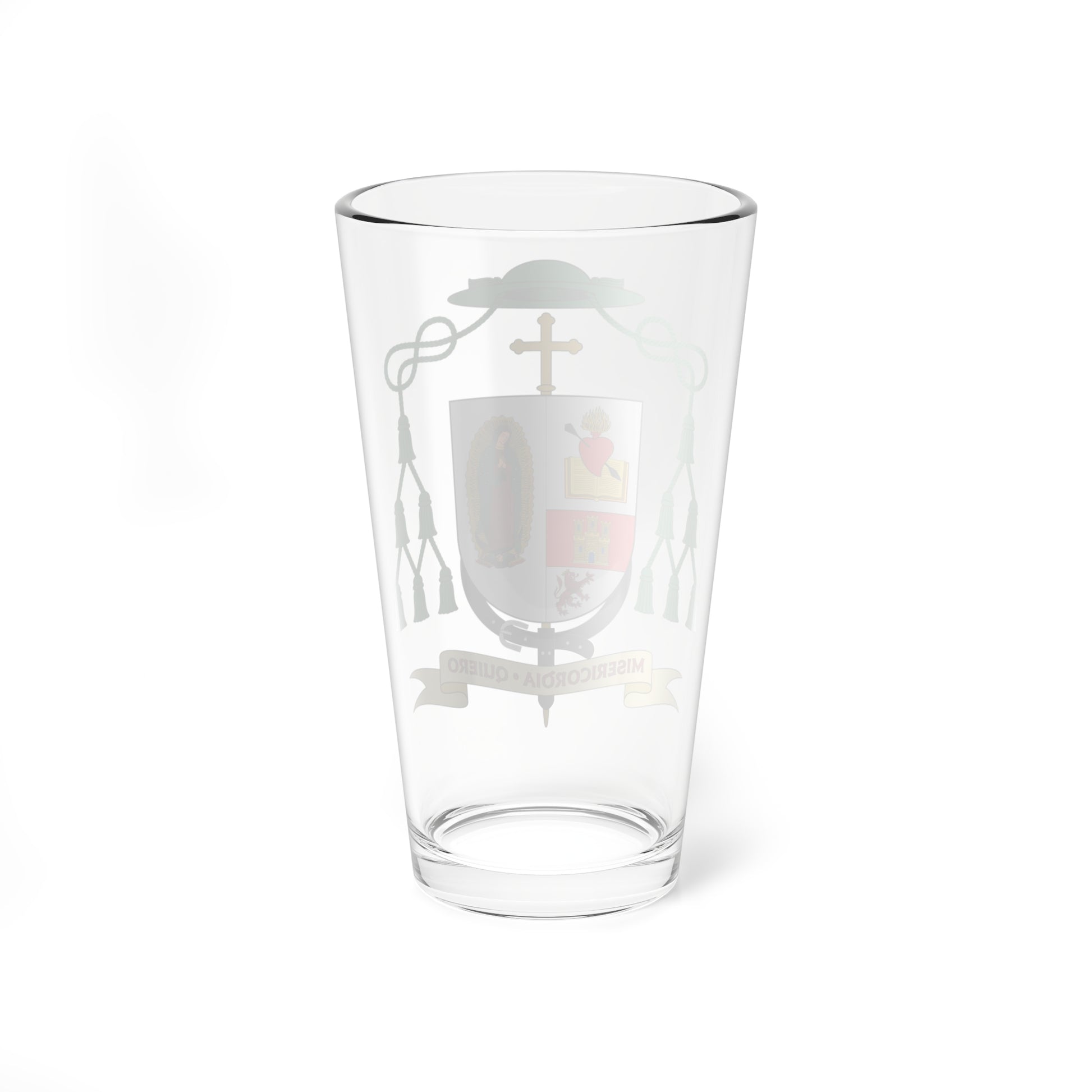 This pint glass showcases the heraldic design of Bishop Francisco Javier Acero Pérez, offering a glimpse into his personal and spiritual identity. The artwork centers around a coat of arms, a visual narrative carefully crafted to represent significant aspects of the Bishop's life and vocation.