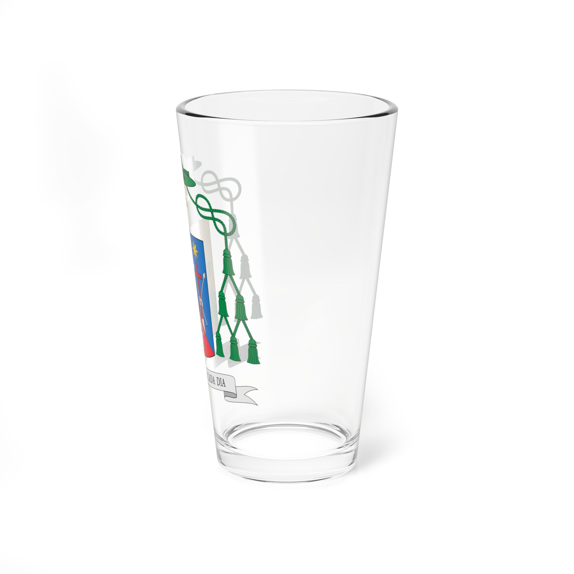 This pint glass showcases the coat of arms (escudo) of Bishop Geraldo Freire Soares, a Brazilian Catholic Bishop. The design is likely of ecclesiastical origin, reflecting the Bishop's role and beliefs rather than a family crest.