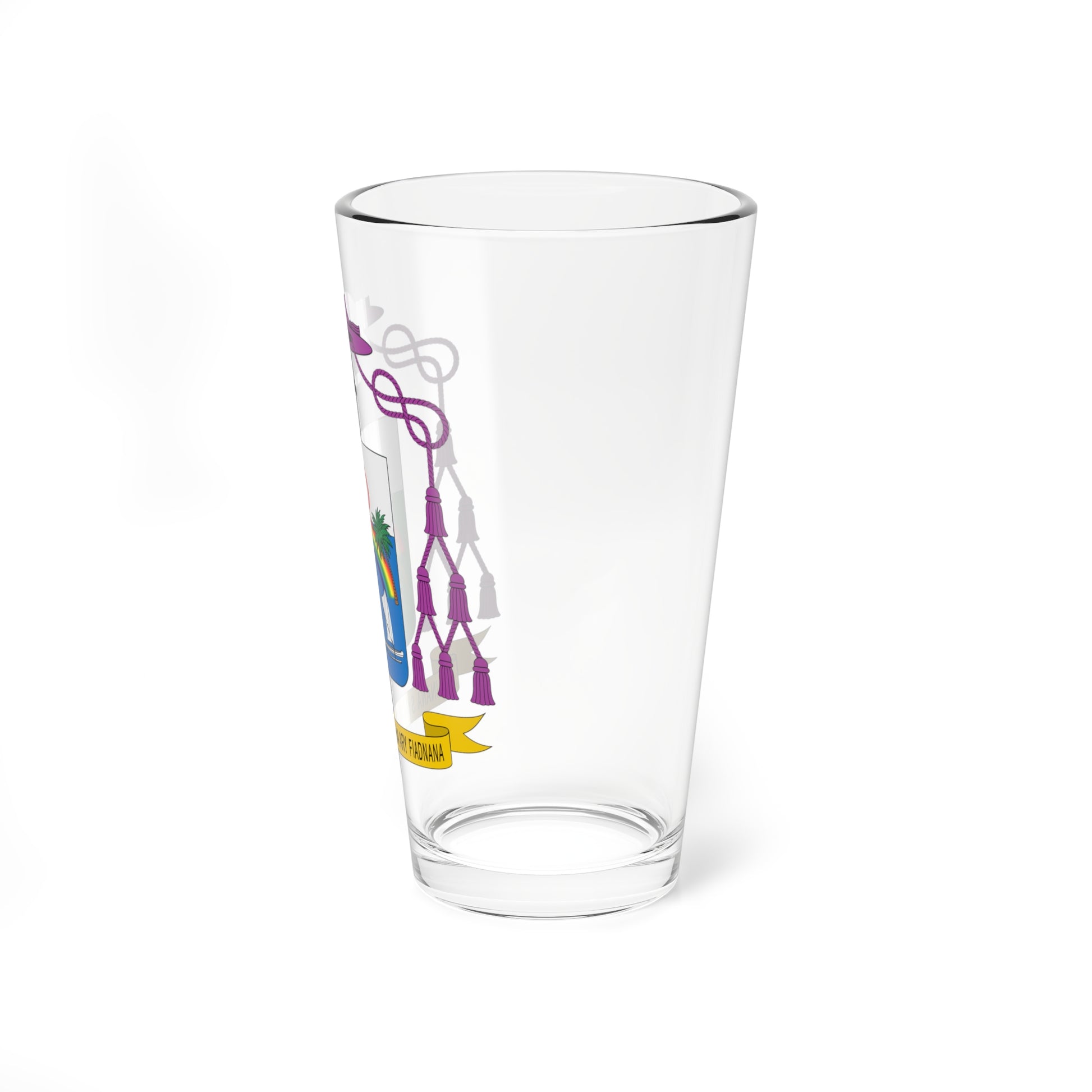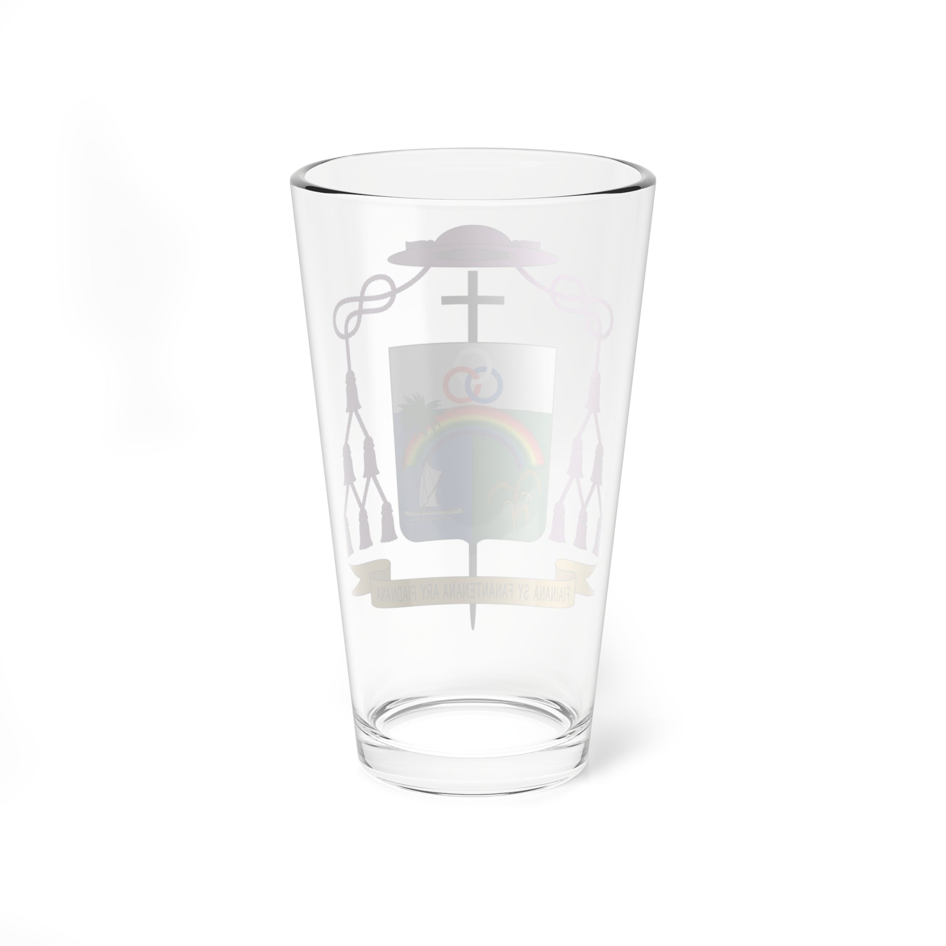 This pint glass showcases the vibrant and symbolic design of the Escudo de Gustavo Bombín Espino, the coat of arms of the Spanish Catholic Bishop.