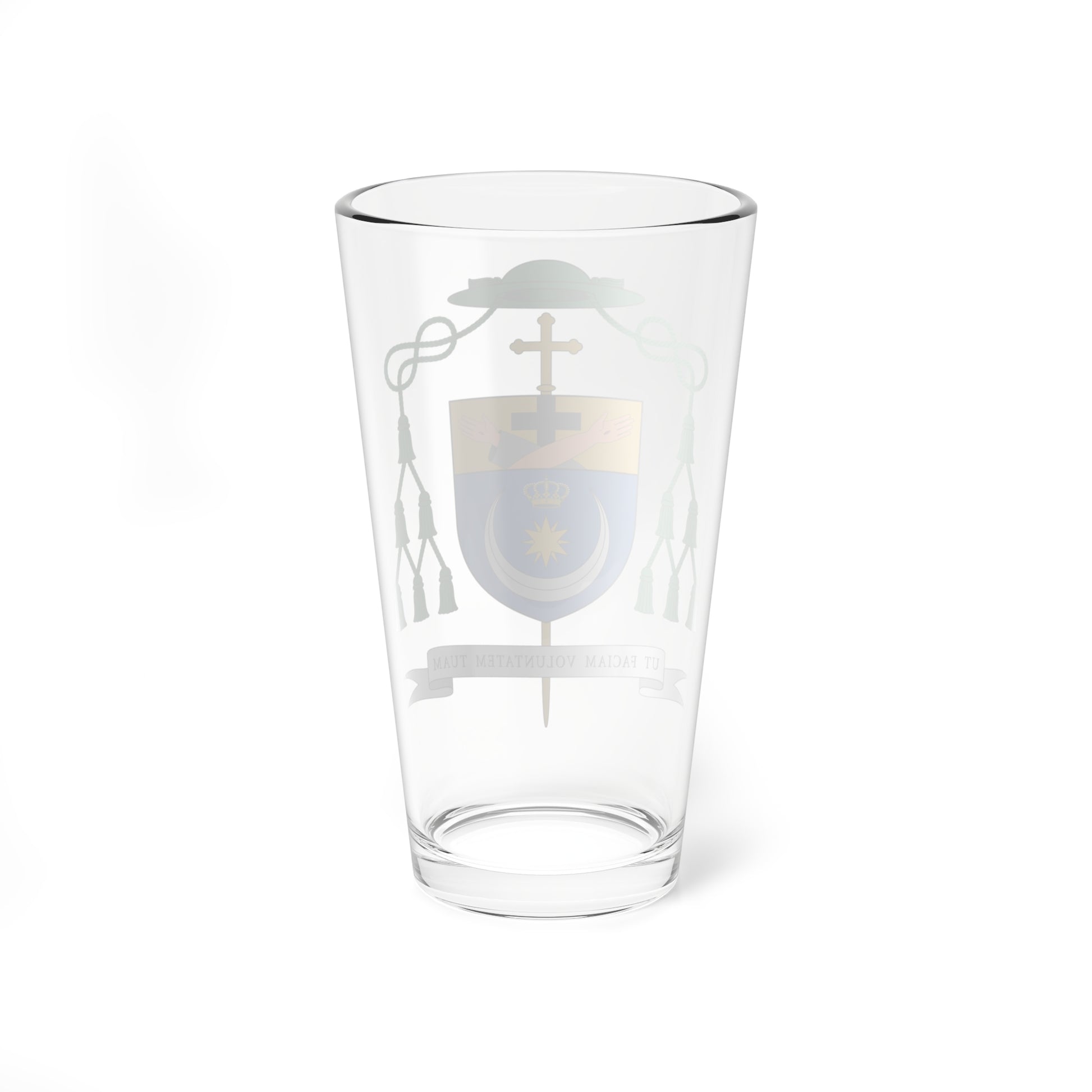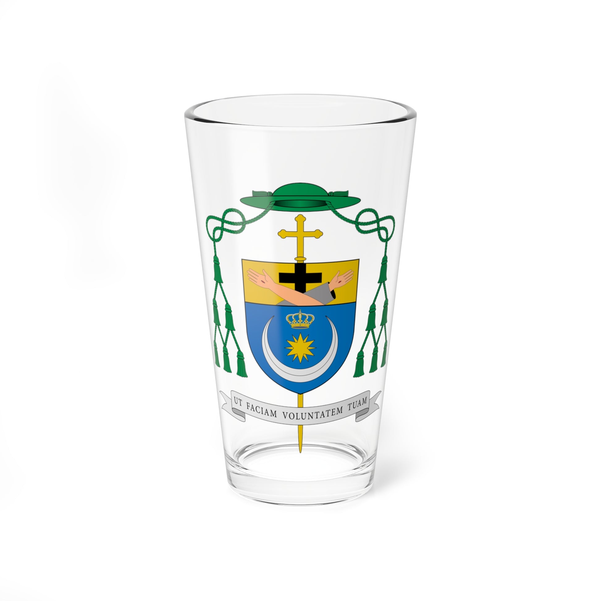 This pint glass features the stunning Coat of Arms of Jerzy Maculewicz, a Polish bishop serving in Uzbekistan. The design is inspired by ecclesiastical heraldry, reflecting the bishop's religious role. It's like a golden shield with a cross and some fancy shapes inside, which probably has some deep theological meaning – but hey, it looks pretty cool on a glass! πŸ˜‰