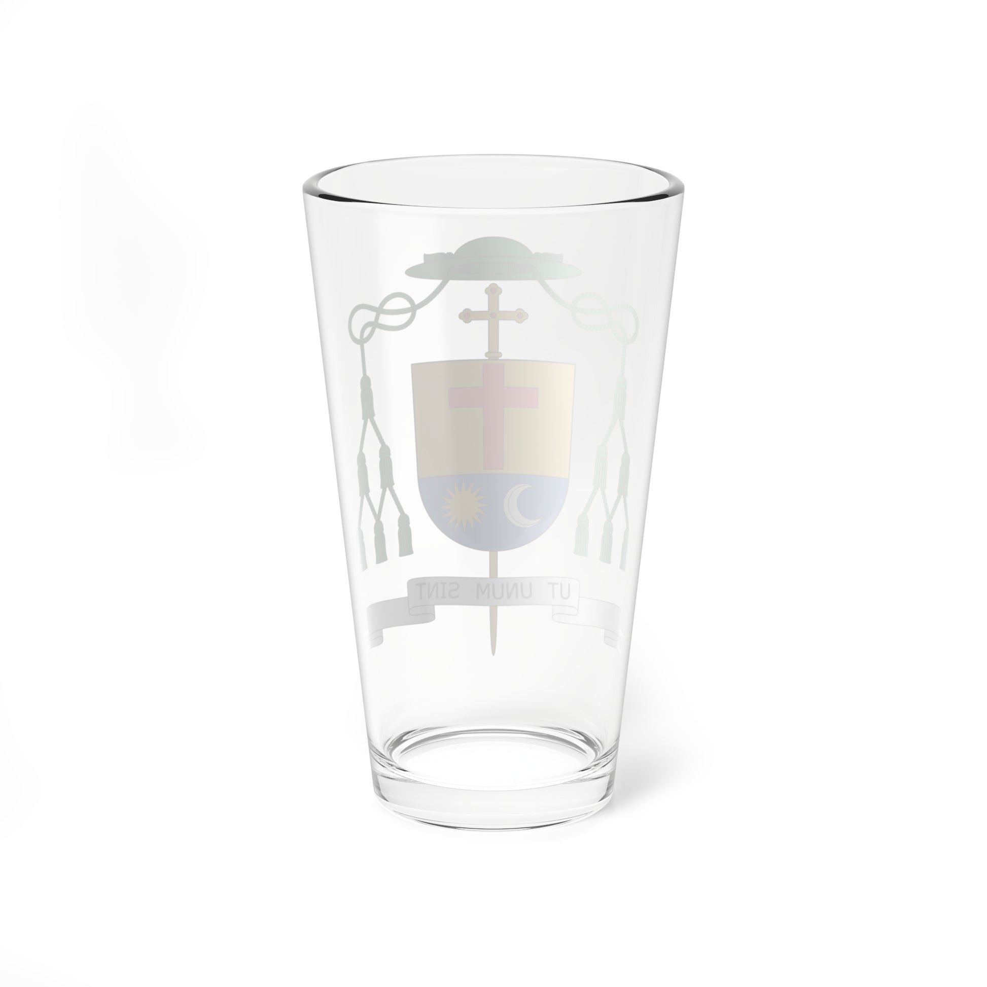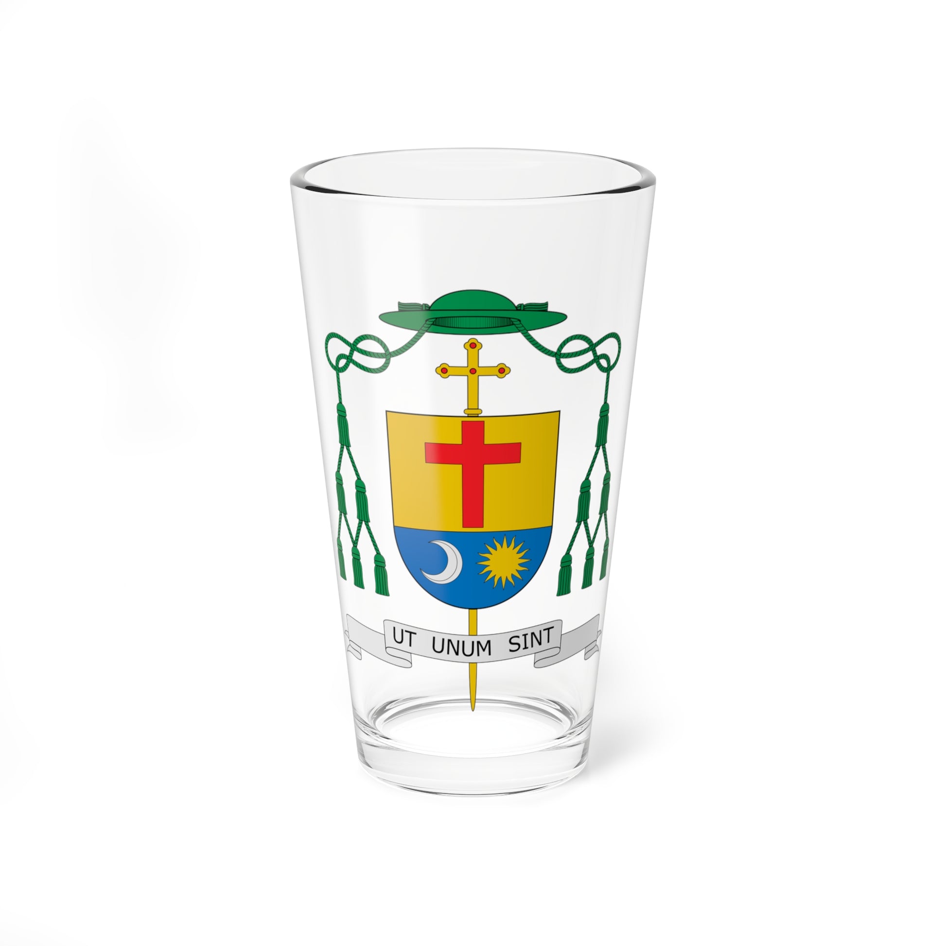 This pint glass features the impressive coat of arms of Bishop Jesús Esteban Catalá Ibañéz from Spain. It's like a medieval badge with a golden cross against a red background, topped with a silver crescent moon and a golden sun with 16 rays. Talk about a heavenly design! 🌞✨ This coat of arms has a rich history and is a symbol of the bishop's noble lineage. It's a fascinating glimpse into the fascinating world of heraldry, those fancy coat of arms you often see in medieval paintings. 🎨 So, if you're a lover of history, heraldry, or simply stunning design, this pint glass is definitely for you! 👑🍻