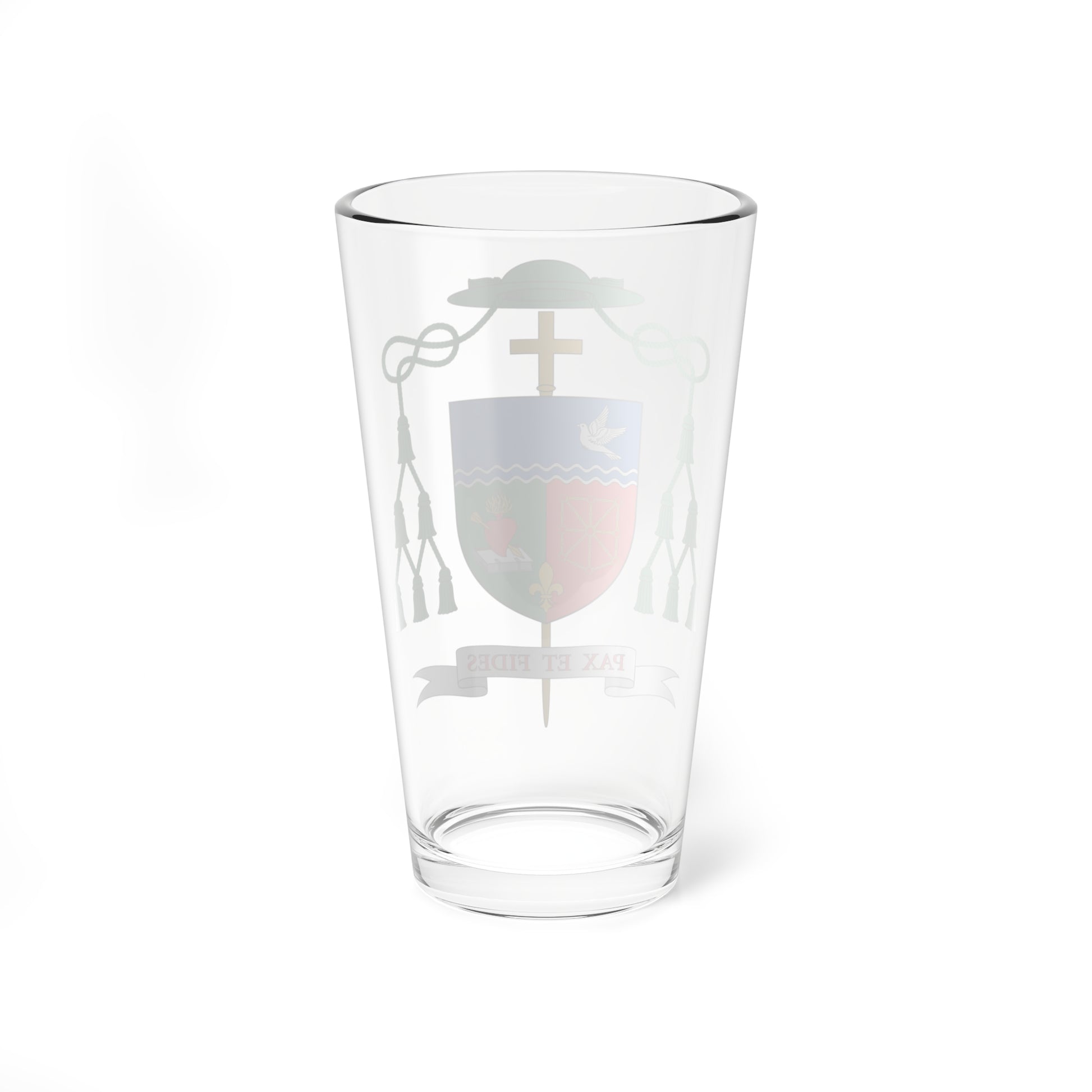 Okay, this pint glass is pretty snazzy! It features the stunning coat of arms of Jesús María Cizaurre Berdonces, a bishop from Spain. 🇪🇸 The design's split in half like a superhero's costume, with a field of golden chains on the left and a lush green field on the right. These colors and patterns actually nod to the old Kingdom of Navarre, which is pretty cool. 👑 I can't help but feel a sense of history and heritage just looking at this glass. It's like a time capsule from Spain's rich past. ✨ If you're a history buff or just love unique and stylish glassware, this pint glass is definitely for you! 📚🍻