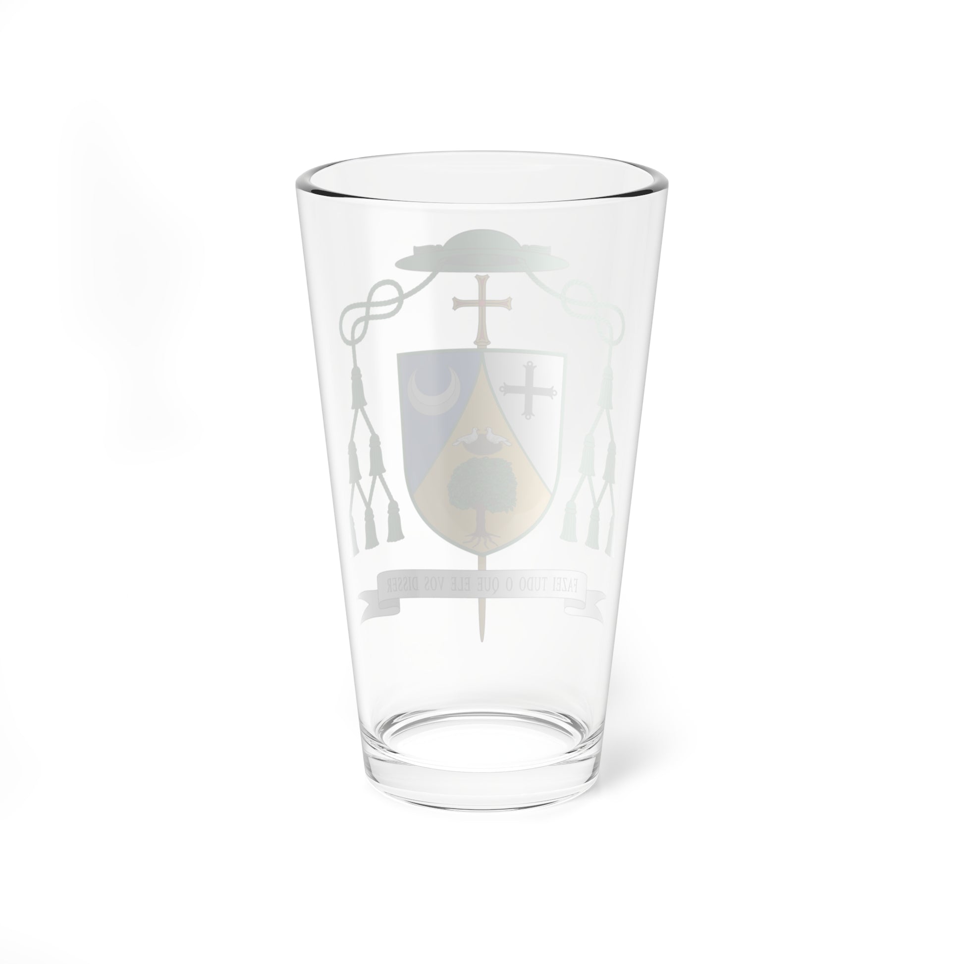 Hey there! Check out this epic pint glass I stumbled across – it's got the Coat of Arms of Joaquim Carlos Carvalho, a big shot bishop from Spain. Now, this fella had a knack for blending his religious and family roots into his official symbol, and the result is pure gold. Think of it as a fancy family crest, but for a bishop! The design features some intricate details – gotta love those fancy coat of arms. It's glossy and smooth, so it'll look super stylish on your countertop. And with a generous 16-ounce capacity, it's perfect for holding your favorite craft brew or cocktail. So, if you're a fan of unique and stylish drinkware with a touch of Spanish history, this is your jam! It's like owning a little piece of religious art, plus it's super practical.