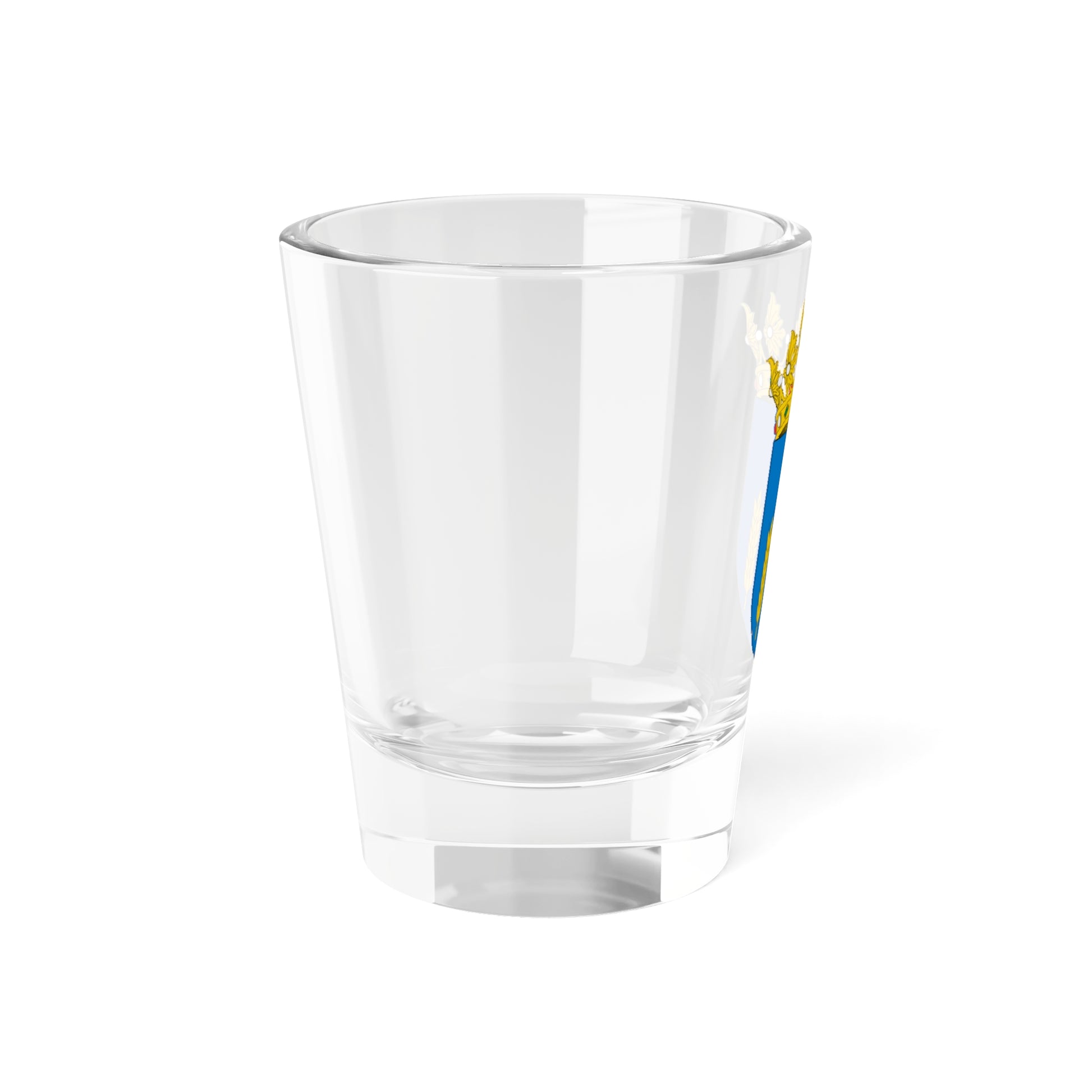This shot glass showcases the heraldic emblem of La Puebla de Albortón, a municipality in the province of Zaragoza, Spain. The design is a miniature reproduction of the official Coat of Arms, a visual testament to the town's identity and heritage.