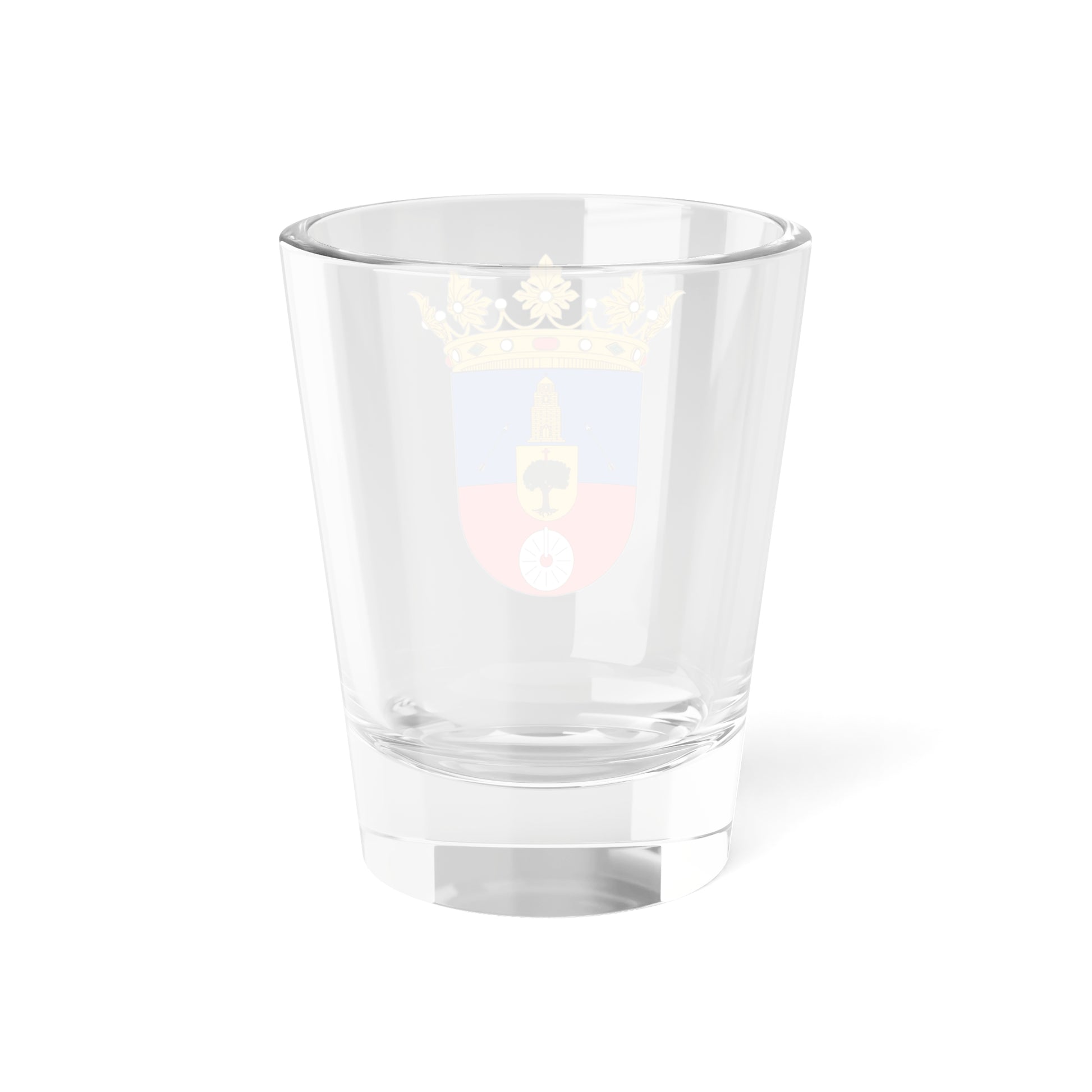 This shot glass showcases the official heraldic emblem of Labuerda, a municipality in the Sobrarbe region of Huesca, Spain. The design is a miniature reproduction of the coat of arms, a powerful symbol of the town's history and identity.