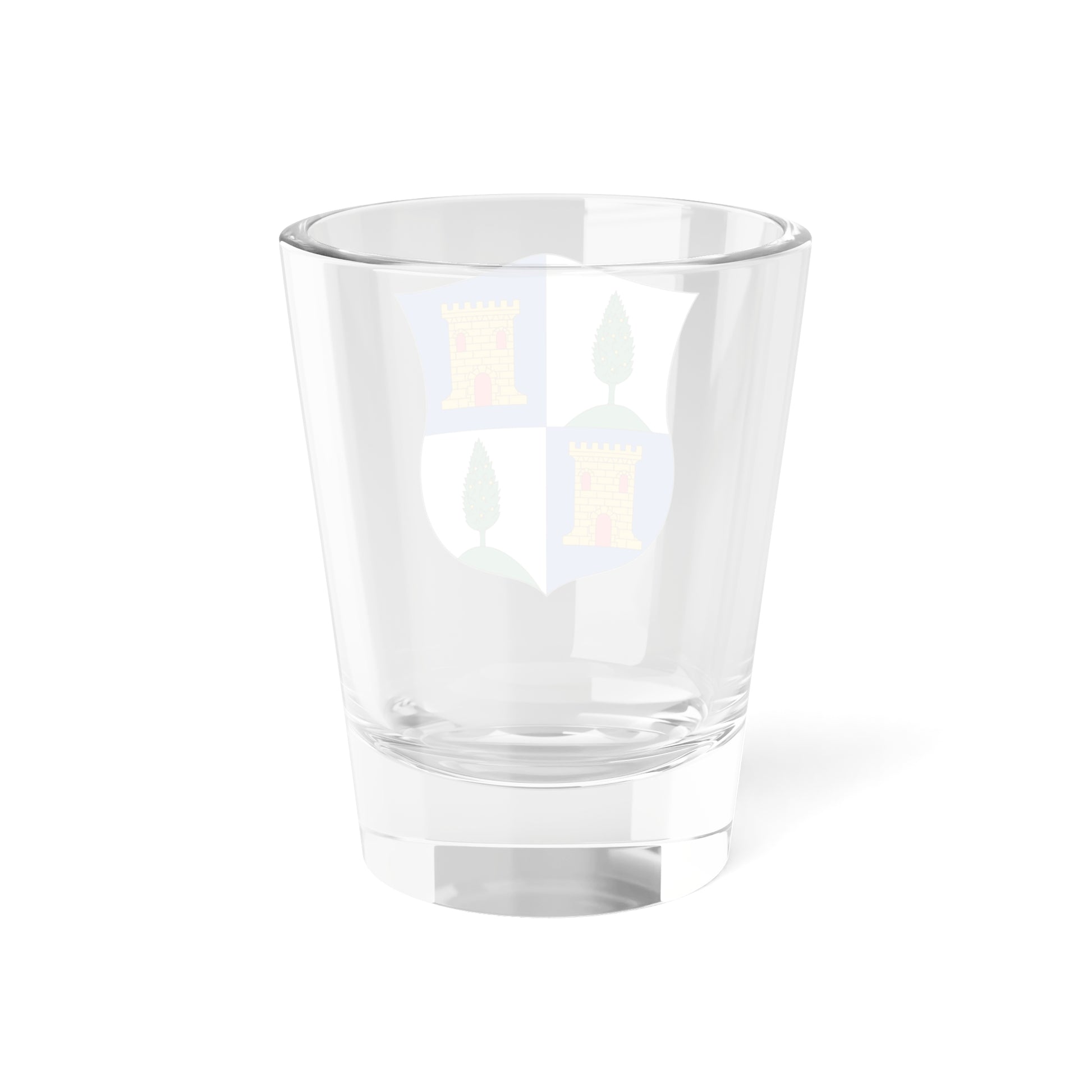 This shot glass features the heraldic emblem of Mequinenza, a municipality in the Zaragoza province of Spain. The design, mirroring the official coat of arms, is a visually rich and historically significant representation of the town.
