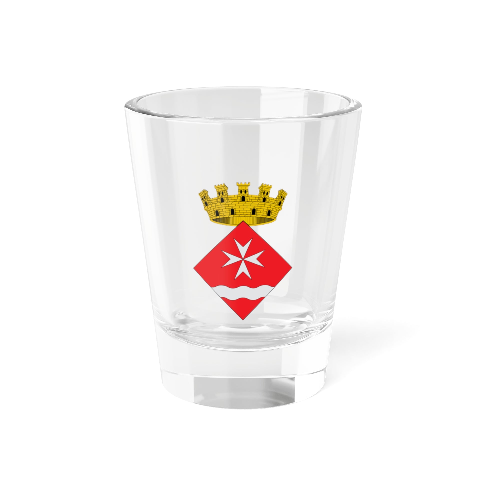 This shot glass showcases the historic coat of arms of Riba-roja d'Ebre, a municipality in Catalonia, Spain. The design is a miniature representation of the town's rich heritage, beautifully captured within the classic Catalan "escut caironat" (diamond-shaped) shield.
