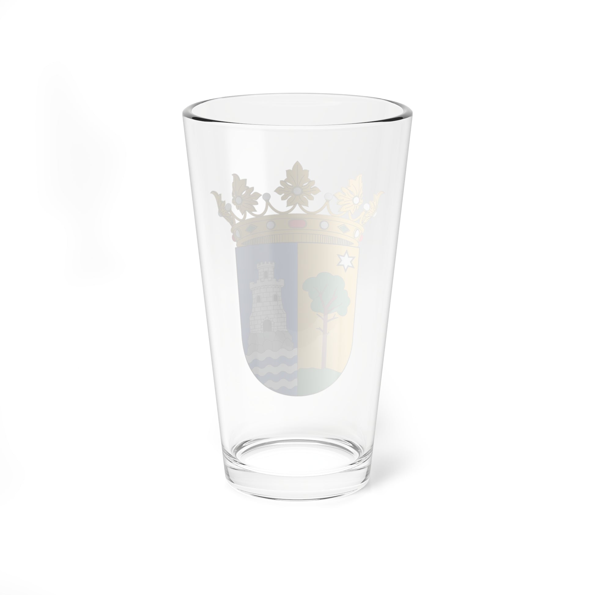 This pint glass features the official coat of arms of San Pedro del Pinatar, a municipality in the Murcia region of Spain. The design, a proud emblem of local heritage, is split into two distinct visual fields.