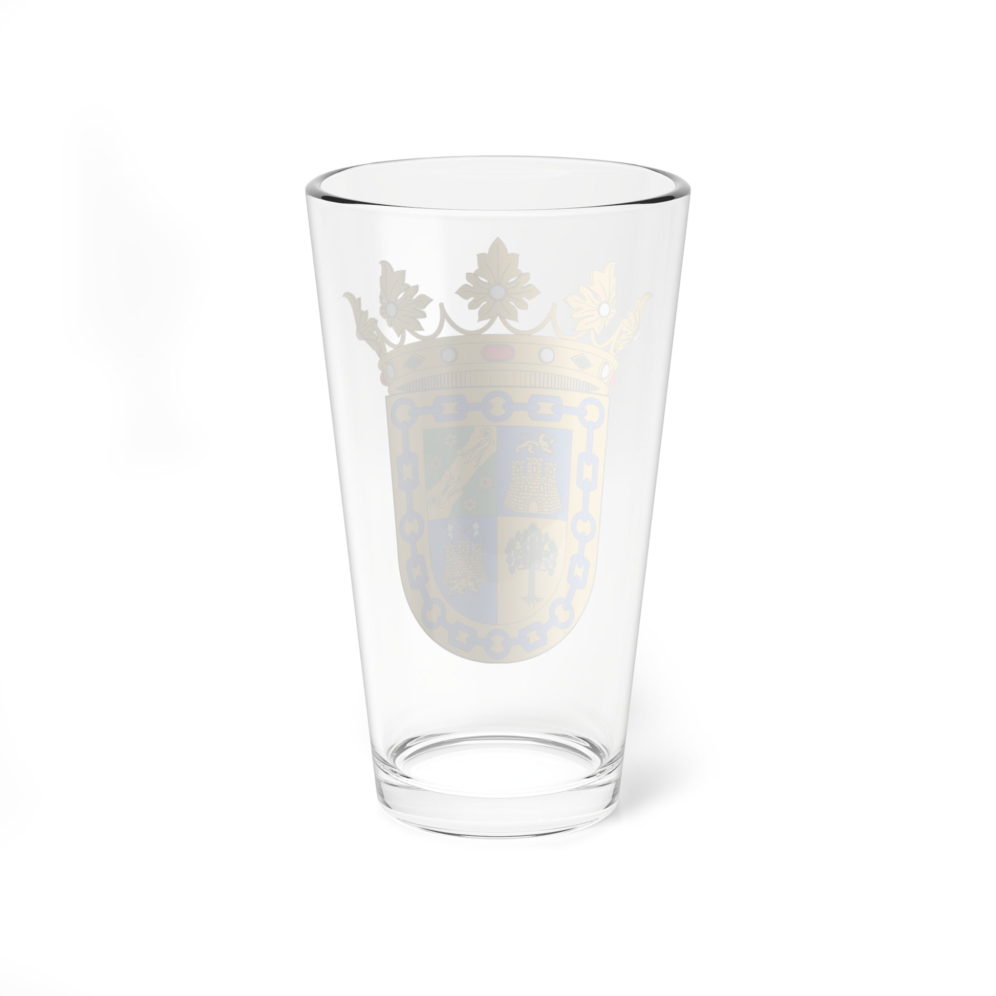 This pint glass showcases the elaborate and historically rich design of the Escudo del Ducado de la Torre, a Spanish coat of arms. The artwork is a faithful representation of the original heraldic shield, quartered to display a collection of symbolic elements, each carrying its own meaning and representing aspects of the Ducado's lineage and heritage.