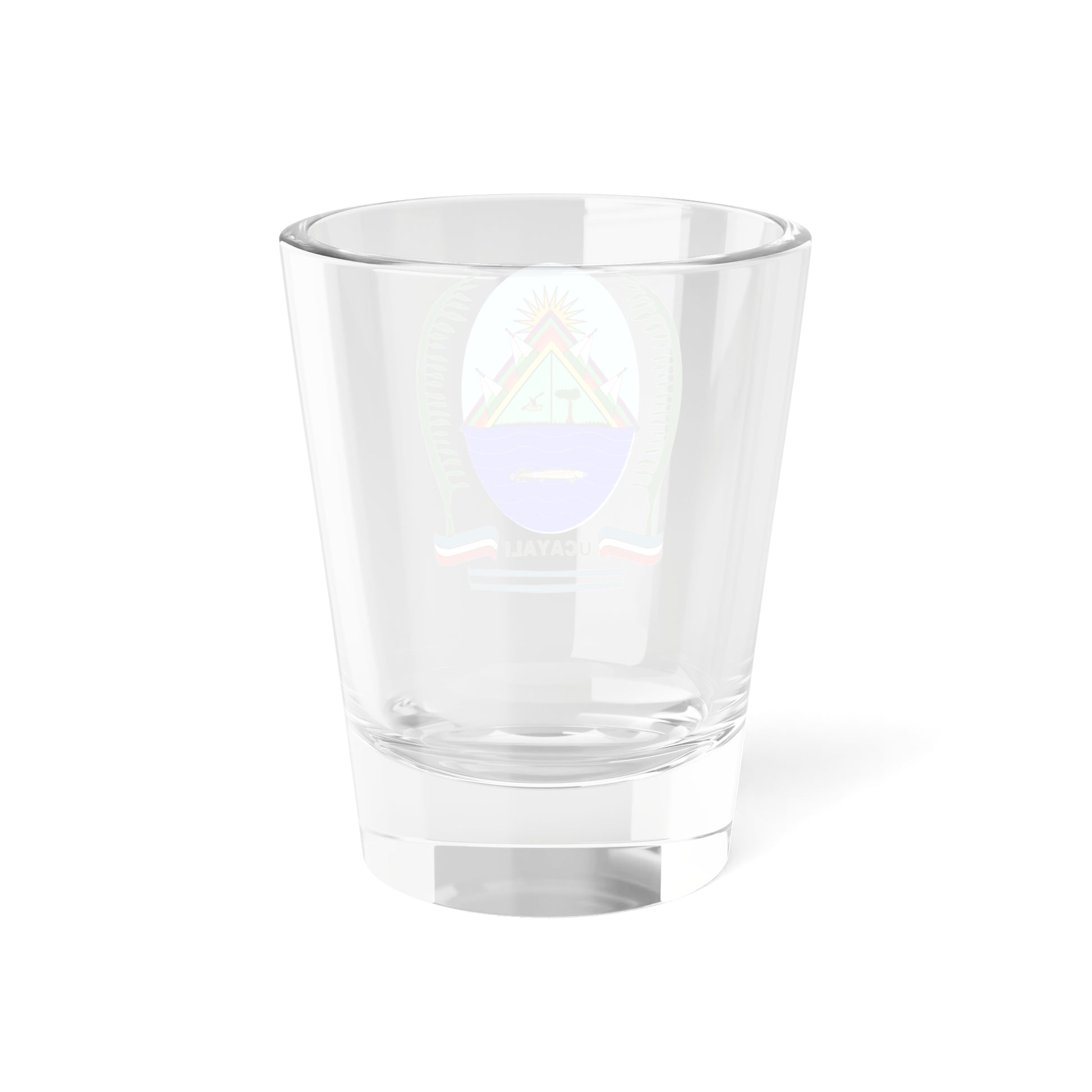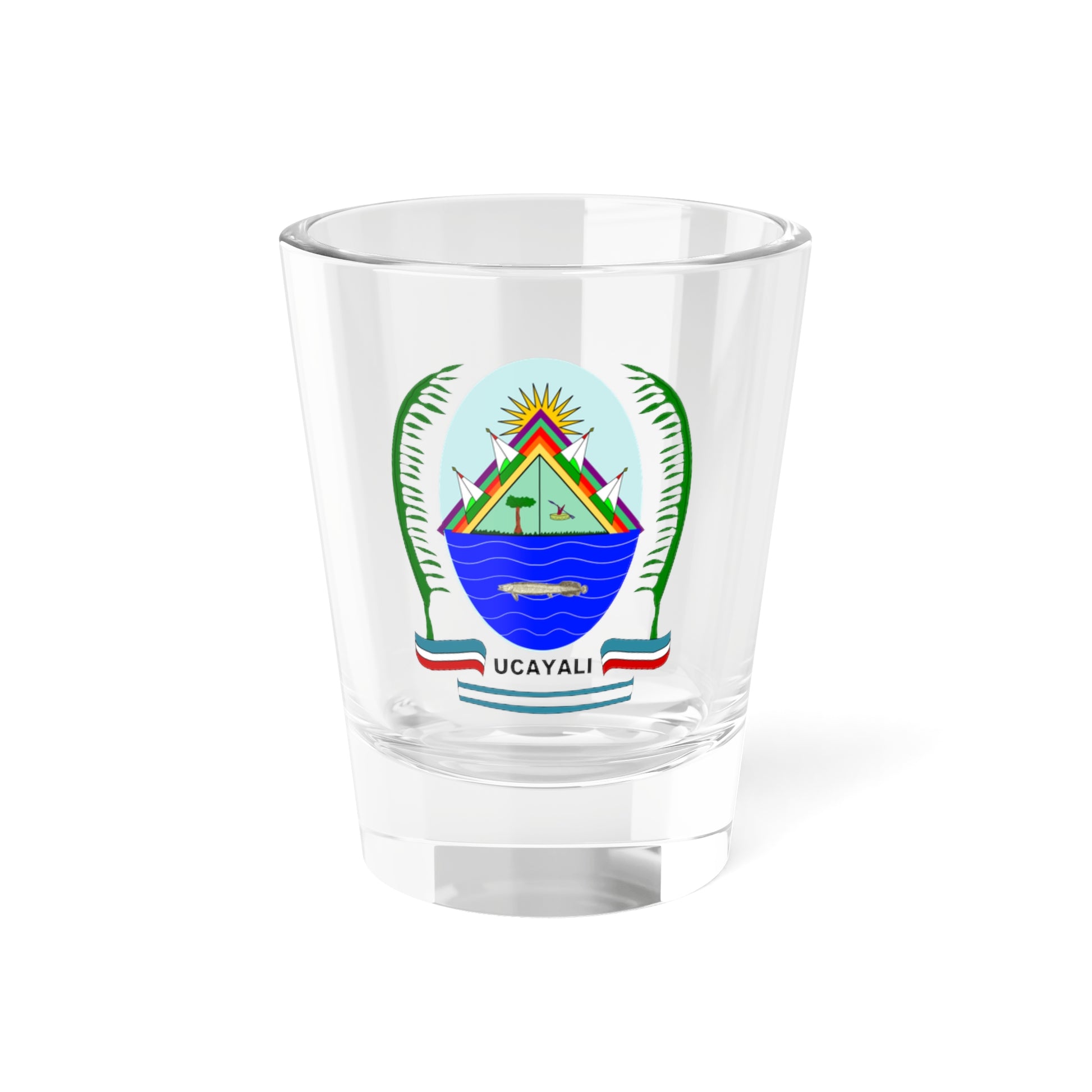 This shot glass showcases the intricate design of the Escudo de la Región Ucayali, the official coat of arms of the Ucayali region in Peru. The artwork is rich with symbolism, reflecting the region's unique identity and natural beauty.
