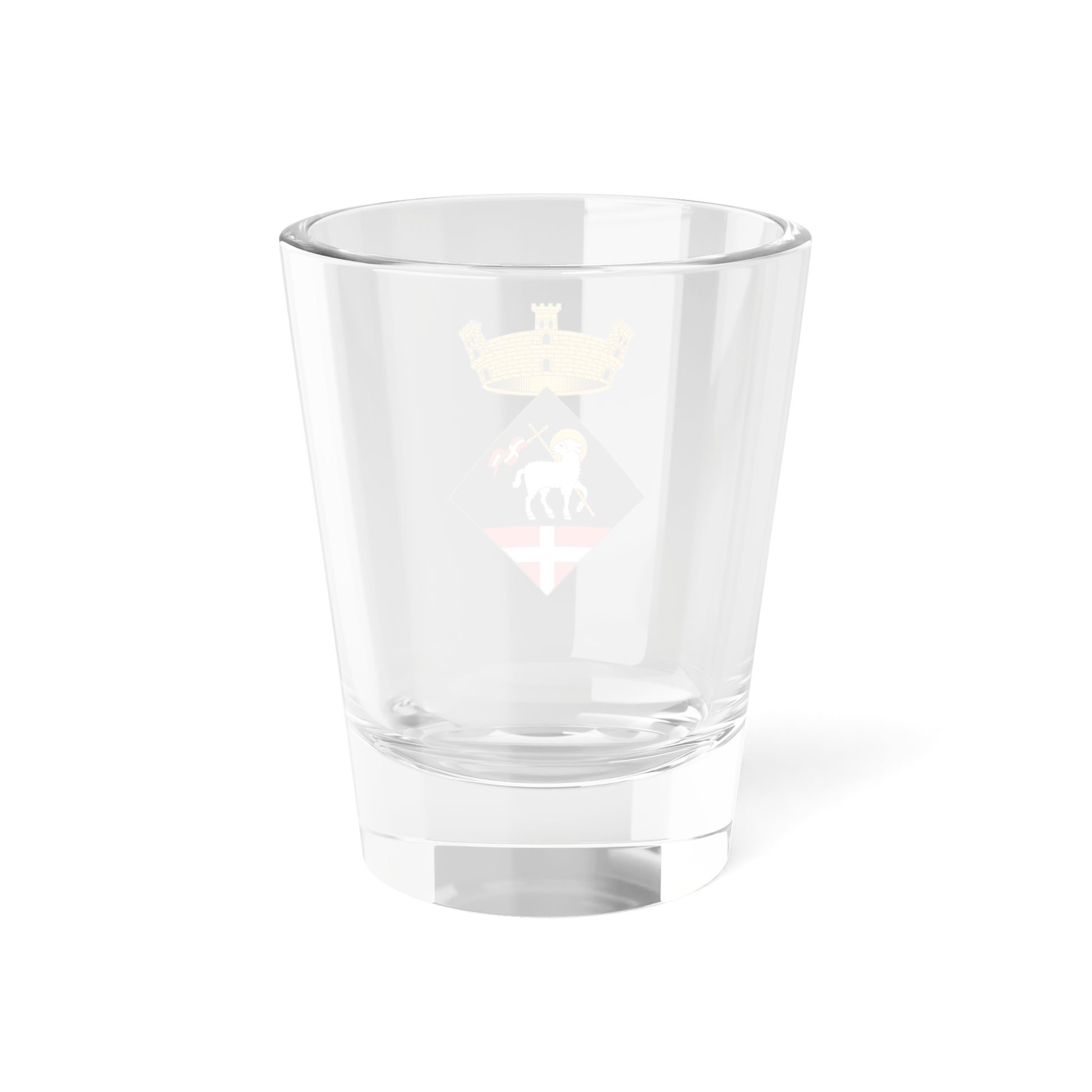 This shot glass proudly displays the official coat of arms of Aiguaviva, a municipality in Girona, Catalonia, Spain. The design is a miniature heraldic masterpiece, packed with symbolic meaning and visual interest.