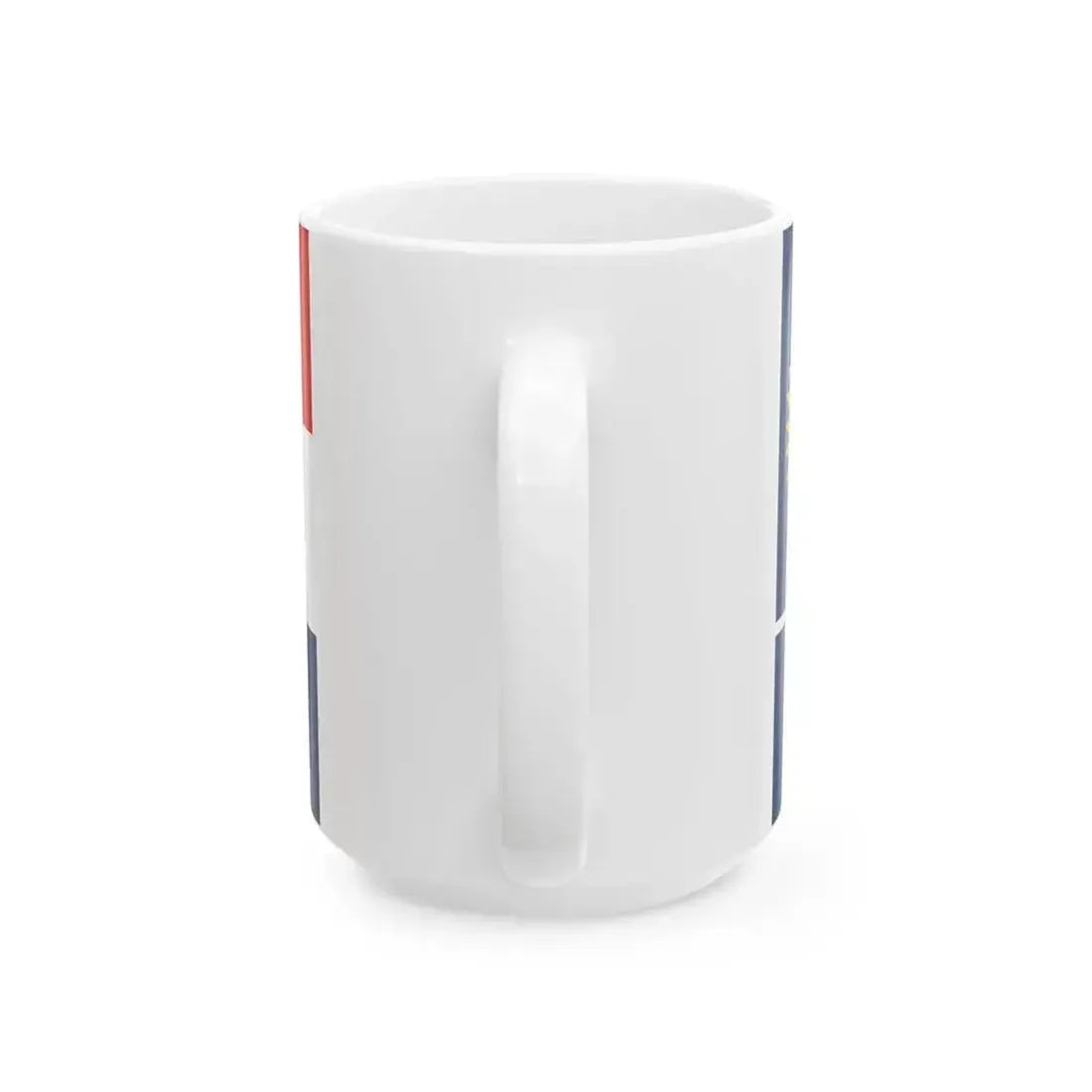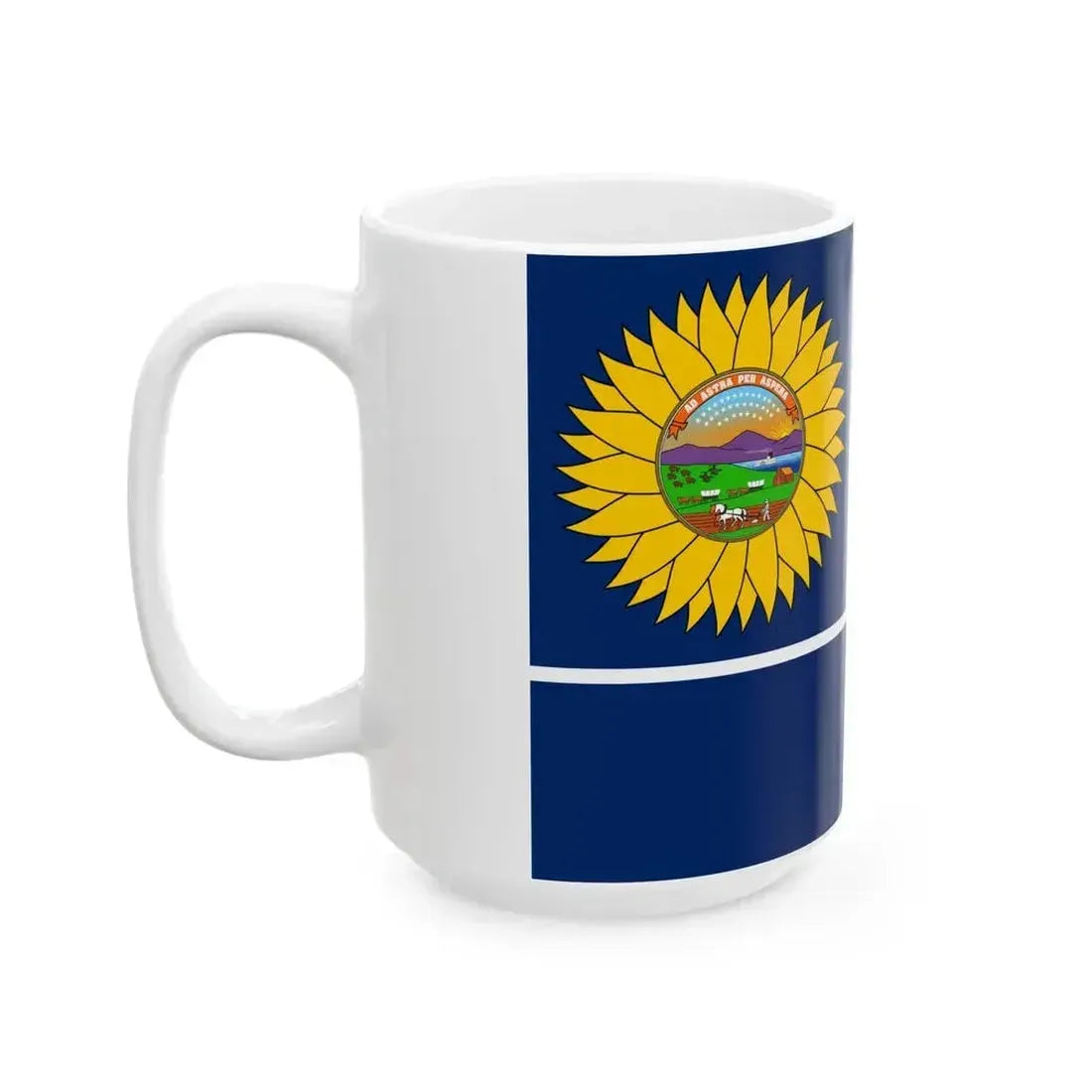 This White Coffee Mug showcases an imaginative design inspired by Esther Northrup's proposed flag for Kansas, a U.S. state known for its rolling prairies and vibrant communities. The artwork on the mug features a stylized rendition of the Kansas flag, which includes a sunflower, symbolizing the state flower, and 21 searsucker stripes representing the original counties when Kansas entered the Union in 1861. This coffee mug serves as an excellent conversation starter for anyone who appreciates unique and cool drinkware with meaningful artwork, or those interested in the history and culture of Kansas.