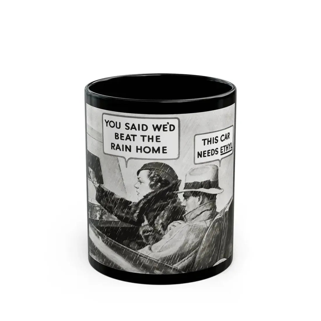 Step back in time with this Black Coffee Mug, showcased in Ethyl advertisement from Redbook's December 1933 issue. This mug features an evocative design inspired by the Art Deco movement of the era, capturing the sophistication and modernity of the 1930s. The graphic on the mug showcases sleek lines, geometric shapes, and a striking use of contrasting black and white tones that will surely add a touch of vintage elegance to any coffee break.