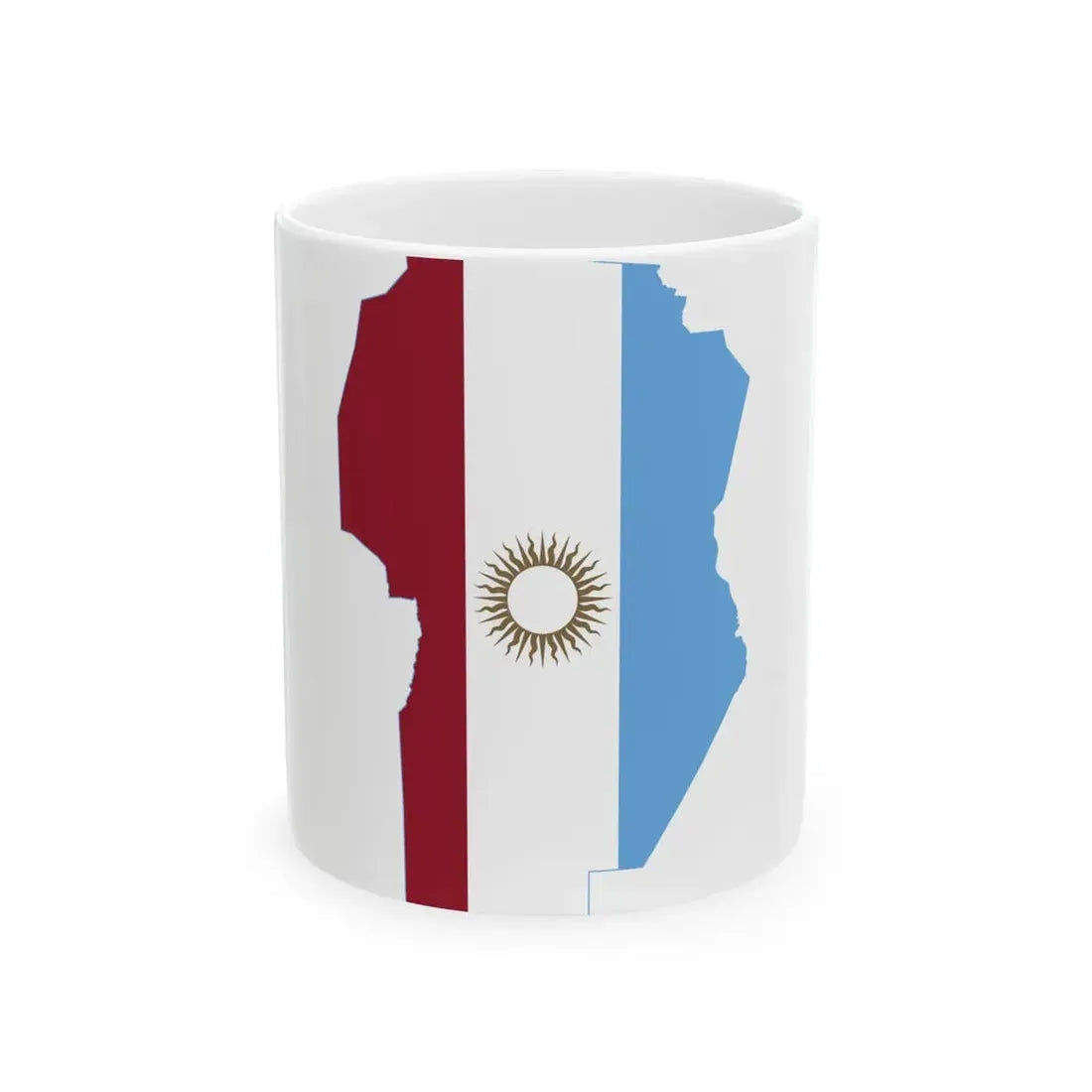 The "Flag-map of Cordoba Province Argentina (Argentina) White Coffee Mug" is a unique piece of drinkware that showcases the geographical design of the Cordoba Province in Argentina. This mug serves as a miniature representation of the province's flag, featuring its distinctive layout of four horizontal stripes in blue, white, red, and yellow. The central emblem, the shield of the city of Córdoba, is also included. This design provides an educational and engaging piece for anyone interested in Argentine geography or regional studies.
