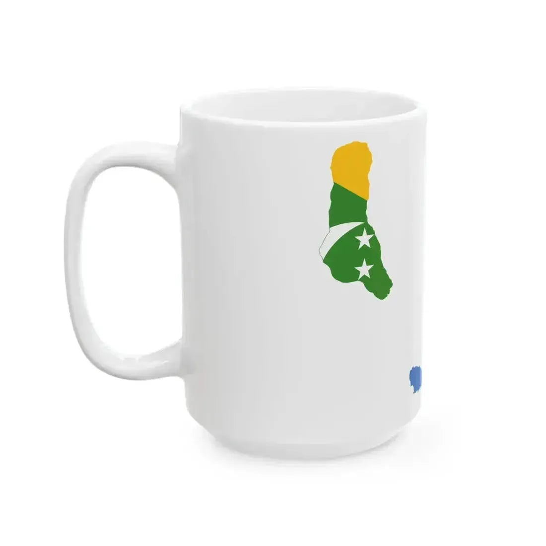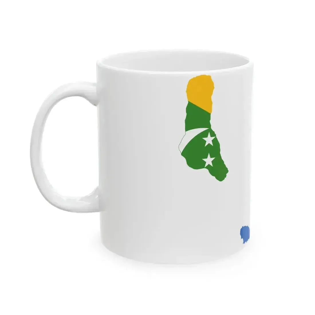 This unique White Coffee Mug showcases a flag map design of the Comoros, an archipelago nation located in the Indian Ocean. The mug's artwork reflects the Comorian flag, which is composed of five horizontal stripes in green, white, red, and yellow, with a small black star at the center of the white stripe. This design is not only visually striking but also symbolizes the unity and pride of the Comorian people. Perfect for anyone who appreciates unique and cool drinkware, especially those with an interest in world geography or Comoros' rich culture.