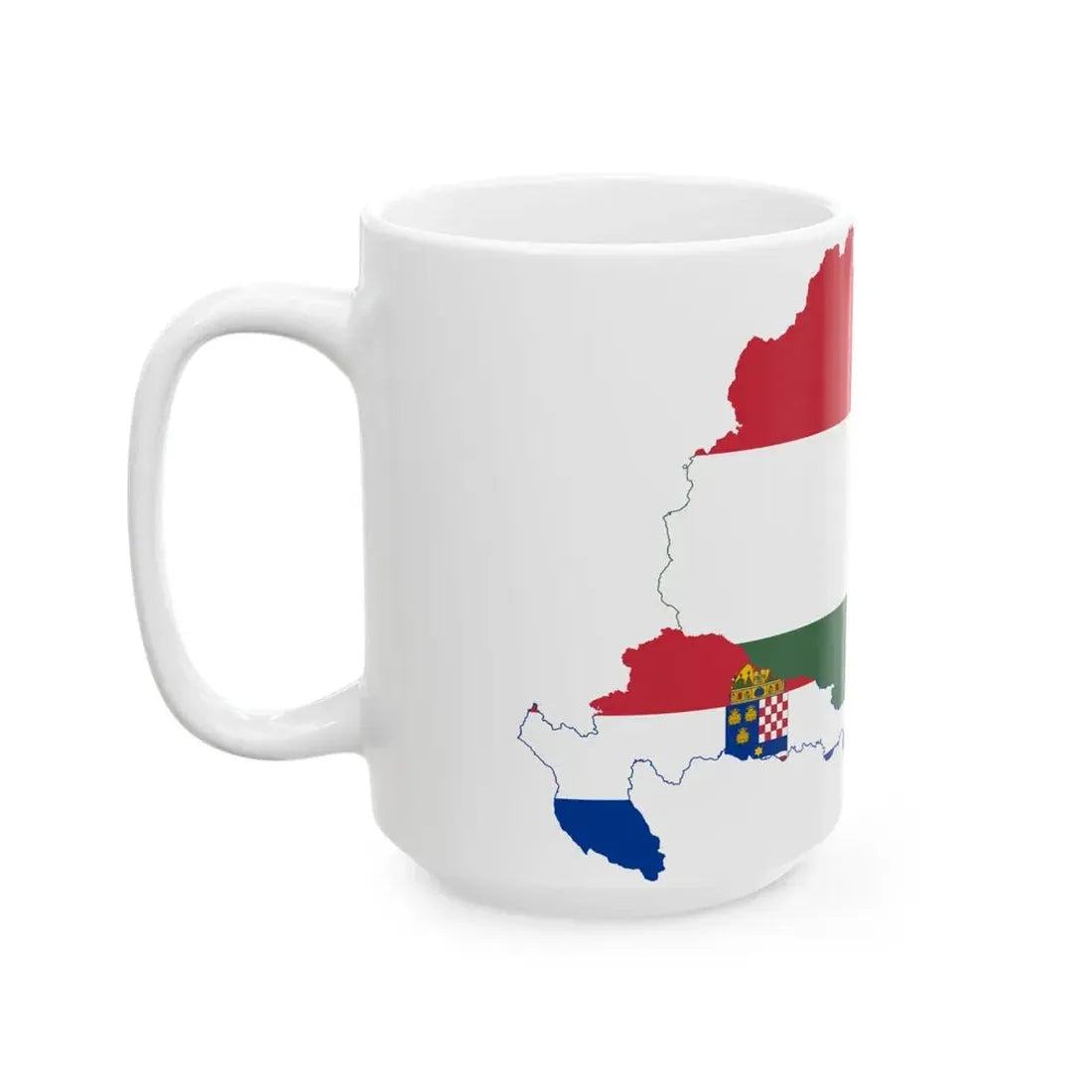 This Transleithania 1896-1915 variant (Hungary) White Coffee Mug provides a captivating conversation starter at your kitchen table. Whether you're sipping your morning coffee or enjoying an afternoon beverage, this map design offers a thoughtful touch to your daily routine. Ideal for history enthusiasts, cartography aficionados, or anyone looking to add a touch of vintage charm to their drinkware collection.
