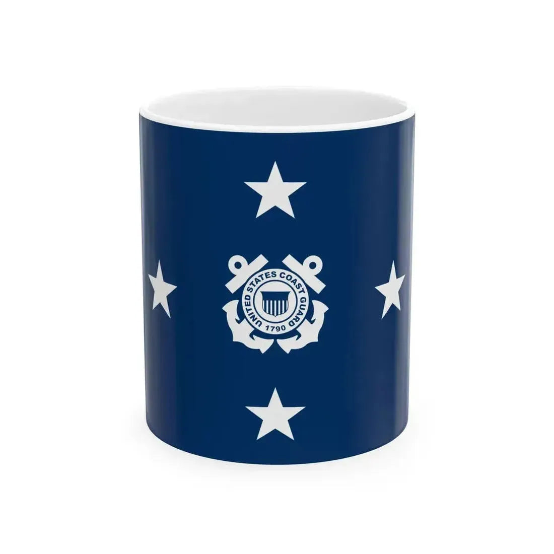 This White Coffee Mug showcases an iconic design inspired by the Flag of a United States Coast Guard Admiral. The intricate artwork on this mug pays tribute to the brave men and women who serve our country as part of the Coast Guard, one of the five armed services of the United States. The mug's design features the American flag prominently, with the emblem of the Coast Guard subtly incorporated within it. This mug makes an excellent addition to any kitchen or office, and is perfect for anyone who appreciates unique and cool drinkware, especially those who have a special place in their heart for the United States Coast Guard.