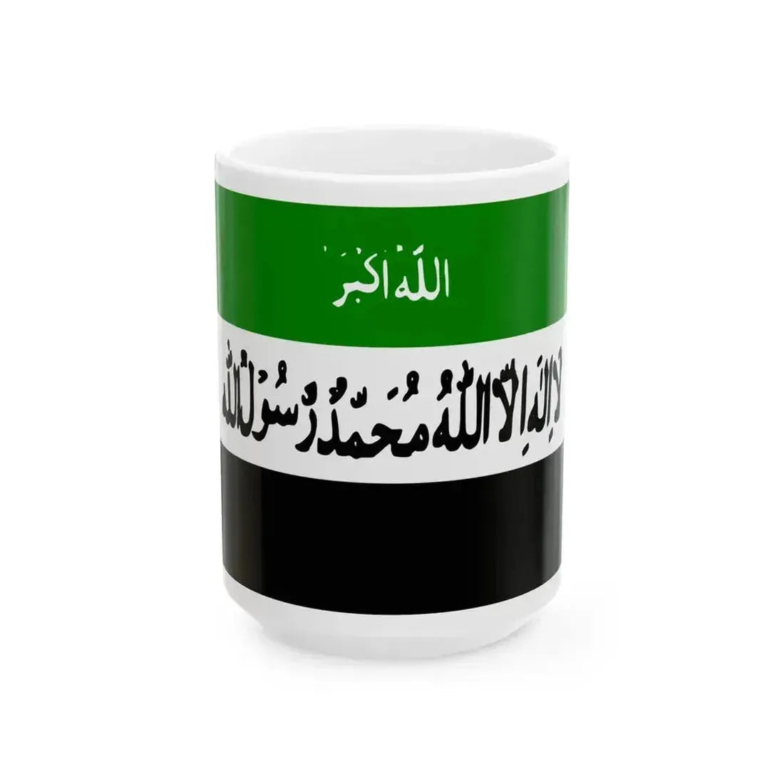 This White Coffee Mug features the design of the Flag of Afghanistan from the year 1992. The flag's design includes three horizontal stripes of black, white, and green, symbolizing the past, present, and future of the nation respectively. At the hoist side, there's a large red spinning wheel known as the Chakr-e-Ali (Wheel of Ali), representing progress and movement. This unique design is perfect for anyone who appreciates unique and cool drinkware and has an interest in Afghanistan's history or culture.
