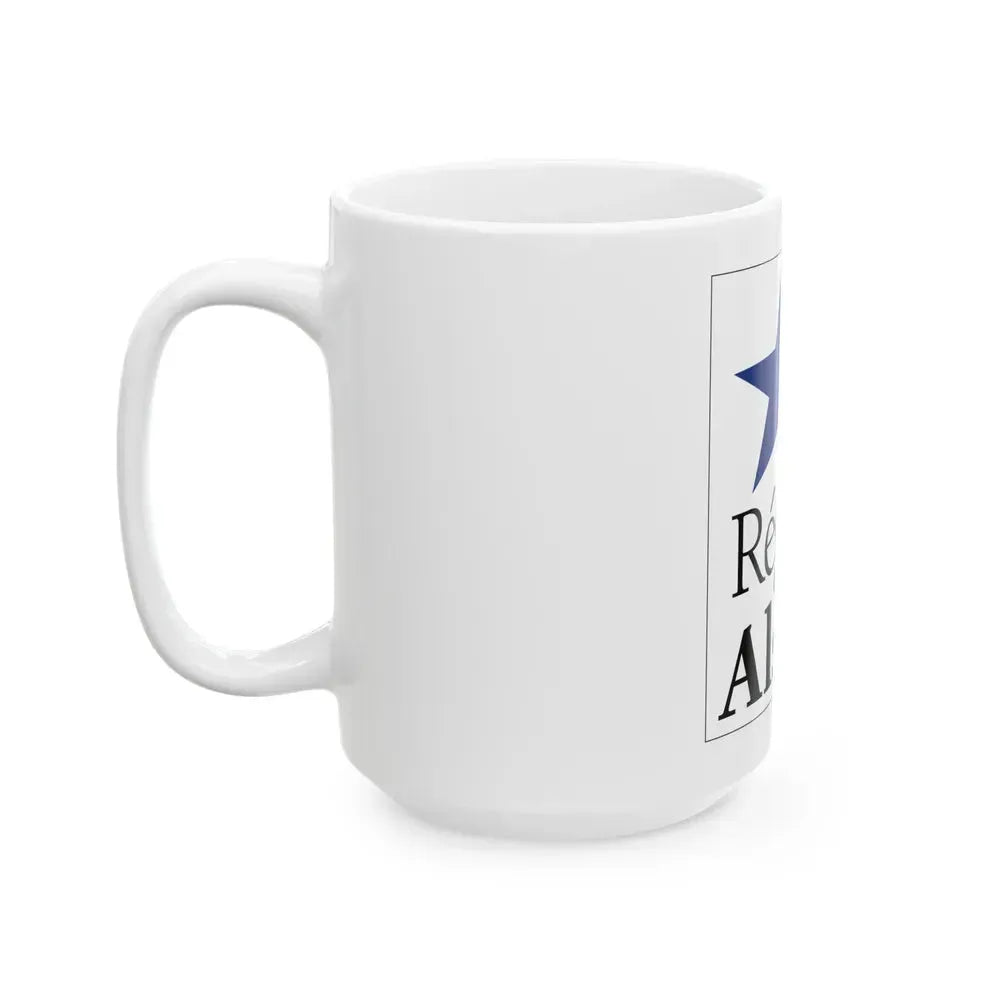 Sturdy white ceramic mugs available in 11 oz (≈330 ml) and 15 oz (≈440 ml), with a glossy finish and comfortable C-handle — microwave and dishwasher safe, and made from lead- and BPA-free materials.