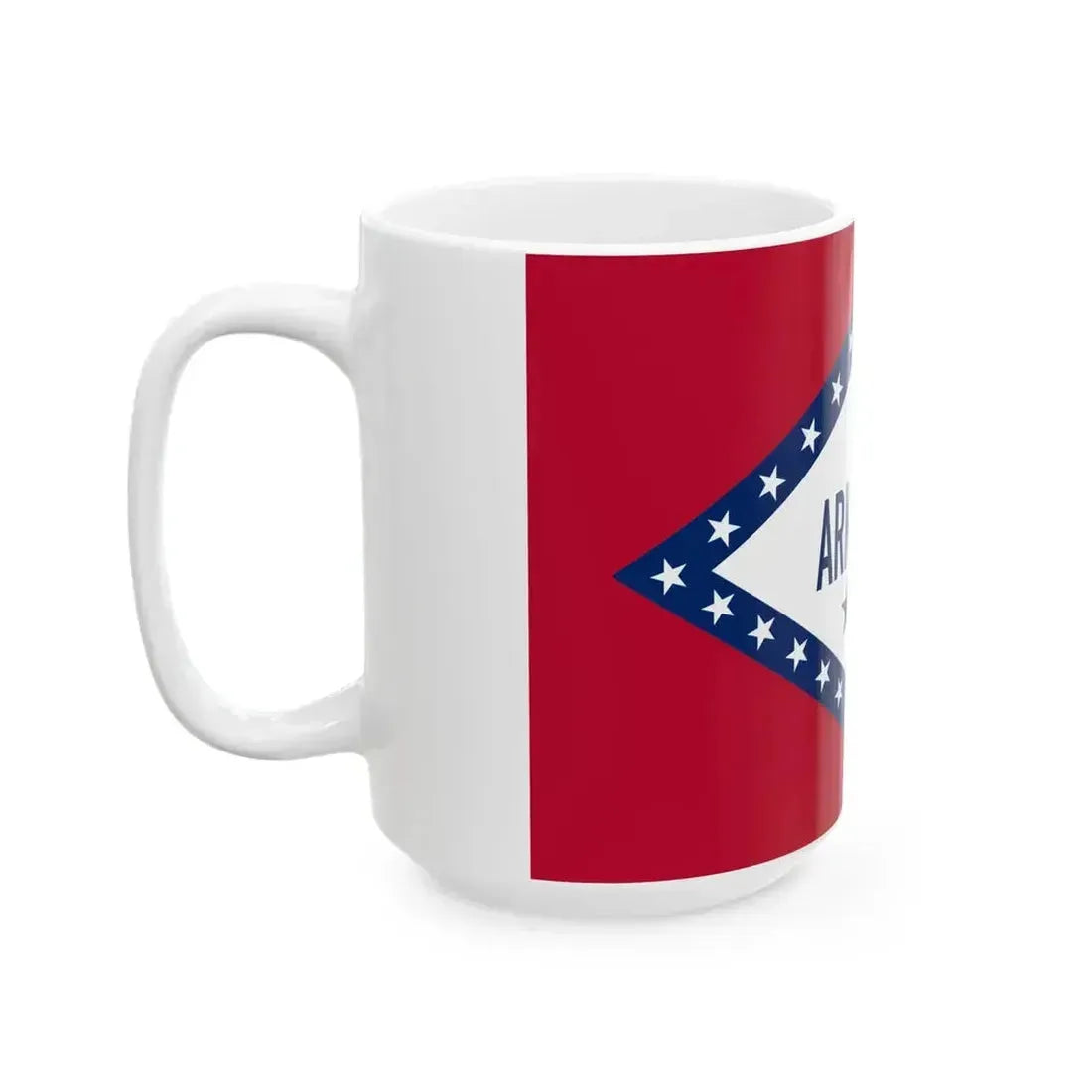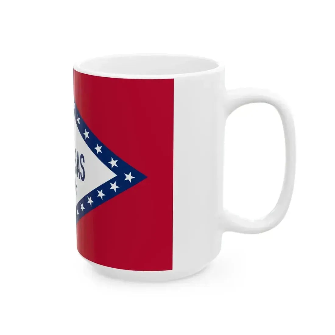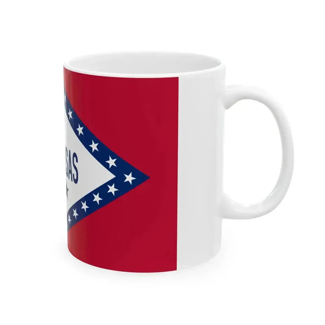 This White Coffee Mug showcases the design of the Arkansas State Flag from 1913 to 1923, a significant era in the state's history. The flag's unique pattern features a diamond shaped symbol, representing Arkansas as the 25th state in the Union, and encased within is the state seal. The seal represents the state's agricultural diversity with symbols of a sheaf of wheat, three cotton bolls, and a dredge for mining. This mug serves as an excellent reminder of Arkansas's rich past, making it perfect for history enthusiasts or anyone who appreciates unique and cool drinkware.