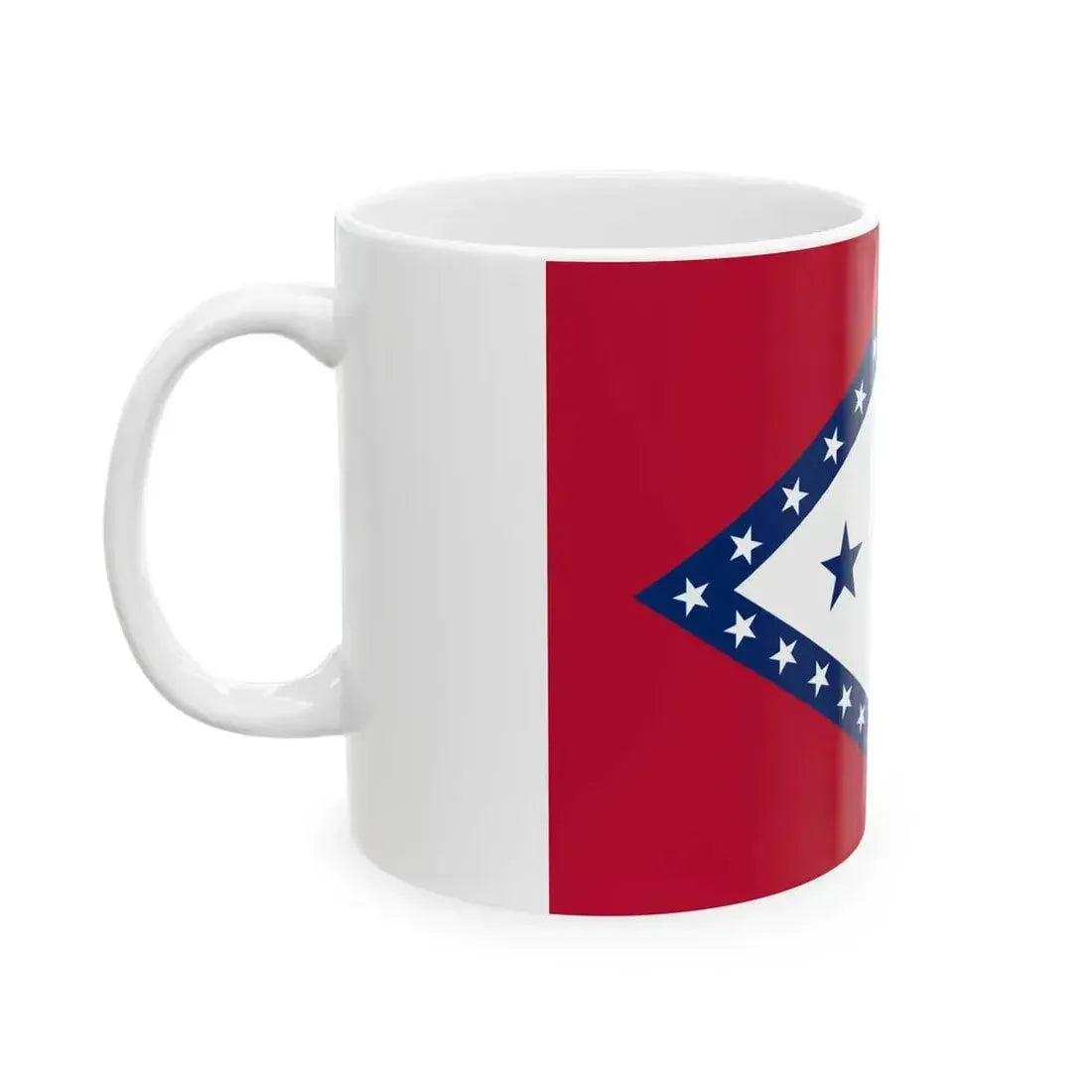 This White Coffee Mug showcases a unique design inspired by the Flag of Arkansas, the 25th state to join the United States Union. The mug highlights the state's official emblem โ€“ a diamond encased within the outline of the state, symbolizing Arkansas's reputation as "The Land of Opportunity." Adorning the body of the mug is the Arkansas state flag, featuring three rows of seven stars in white on a blue field. The top row represents the seven original southern states that seceded from the Union, while the two lower rows stand for the five territories or states formed within the former Confederacy after the Civil War.