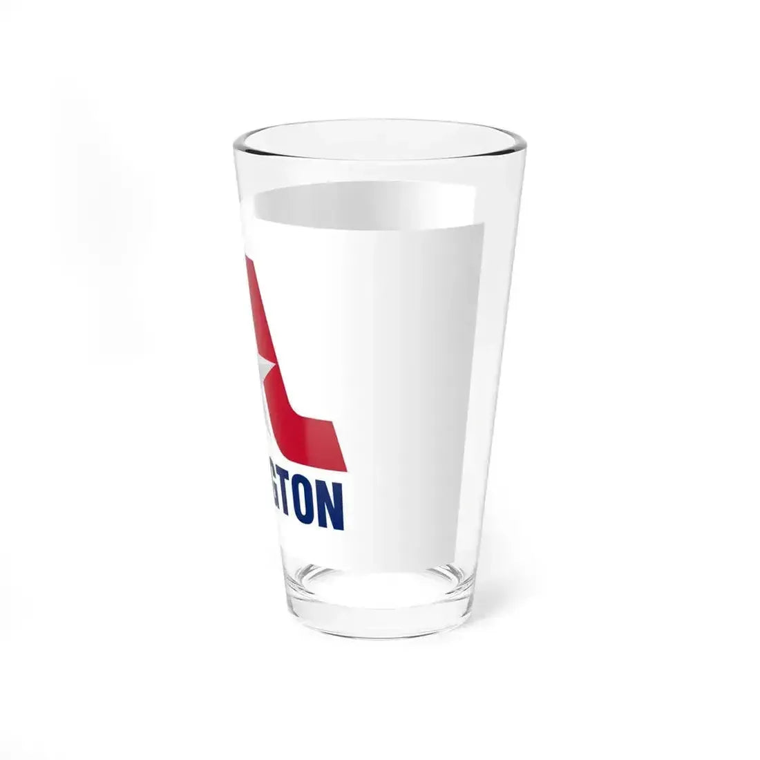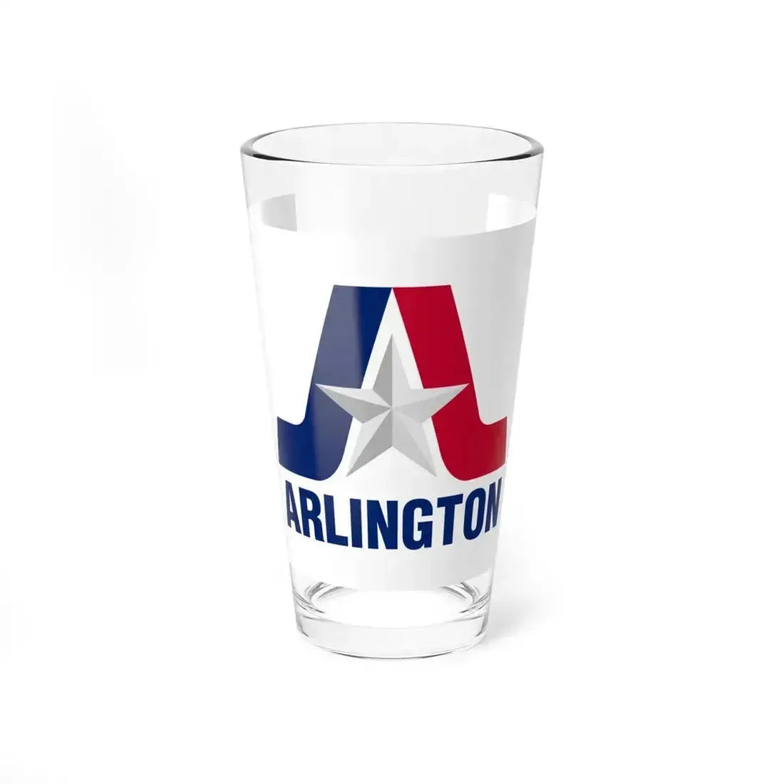 The Flag of Arlington, Texas Pint Glass is a unique drinkware item that showcases the pride of this vibrant city. This 16oz glass features an intricate design inspired by Arlington's official flag, which incorporates a star symbolizing its status as a Texas city, and a red torch representing progress and enlightenment. The background consists of alternating stripes of white and green, symbolizing the Lone Star State and the verdant landscape of Arlington respectively.